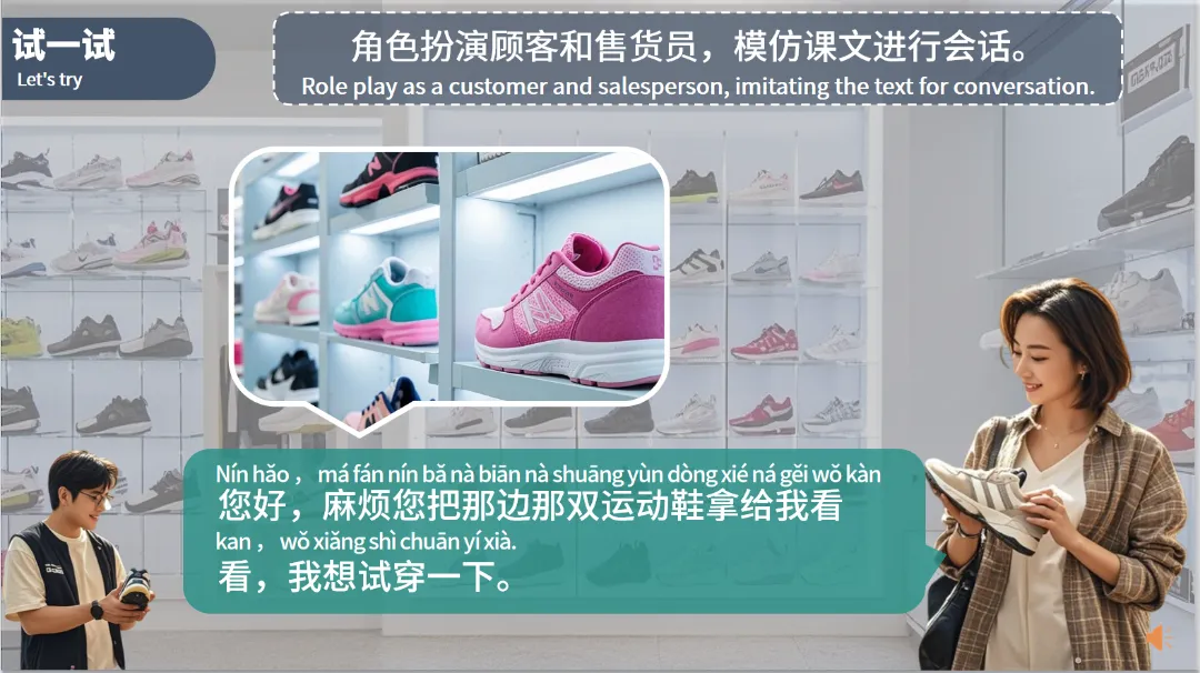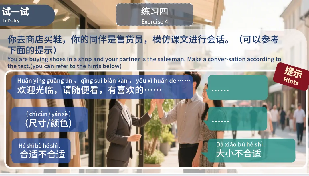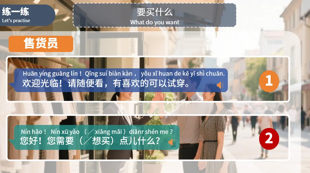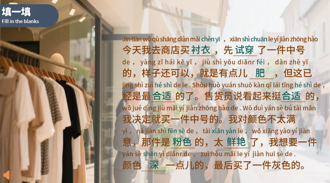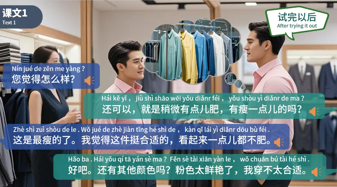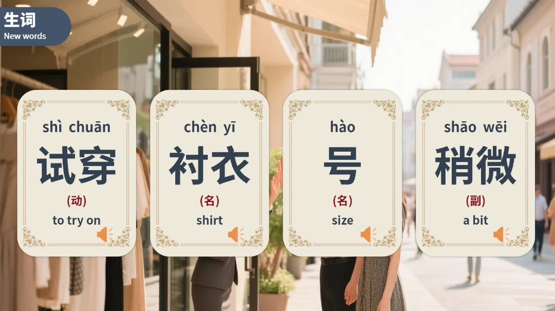试穿(shì chuān)(动):to try on,搭配衬衣试穿场景,掌握 “试穿衣物” 的基础表达。
