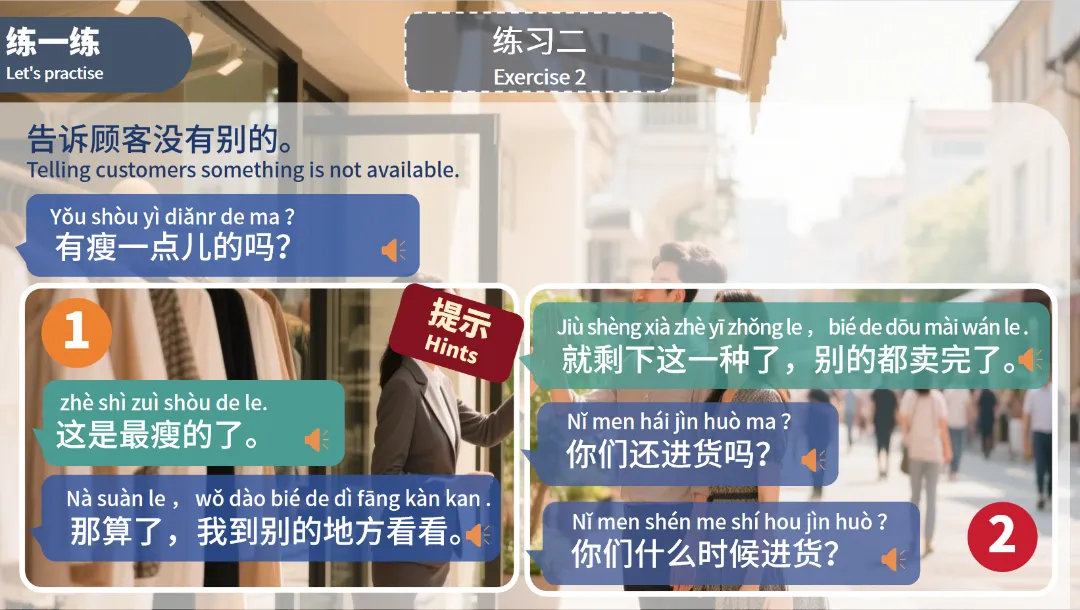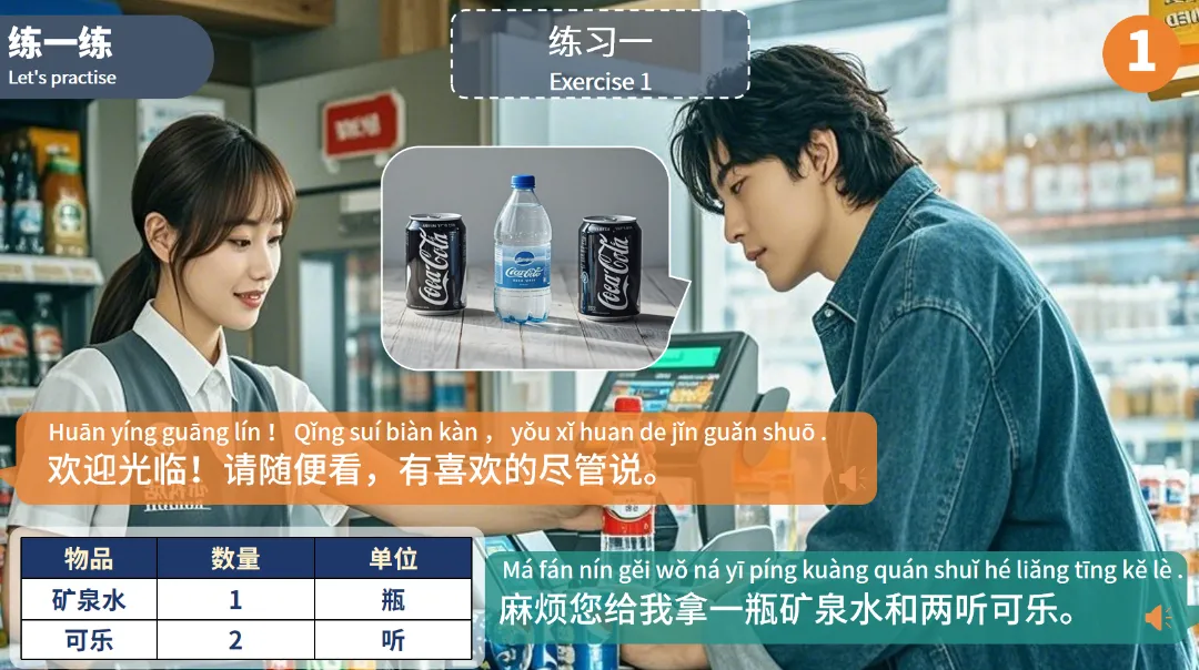 生词搭配真实购物场景,让抽象词汇变得具体可感,降低记忆难度。
