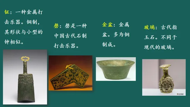 金盆:金属的盆子。银钲:一种银色金属打击乐器。玉磬:一种玉石打击乐器。玻璃:古代常指一种玉石。(注意字的偏旁,金字旁和玉字旁的区别)