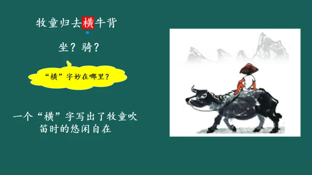 (1)诗句中哪个字写出了牧童悠闲自在的样子?引导比较“横”与“坐”“骑”的不同表达效果:横坐在牛背,说明牧童的姿态很随意,很自由。
