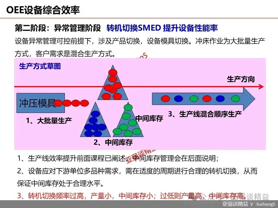 第2种情况:每台设备是批量生产、节拍不同且独立,比如冲床设备。此时设备与设备之间产生库存,需要计算最大最小安全库存,在制品库存最小情况是效率考评指标的要求(物料指标体系详讲),和OEE无直接关系。
