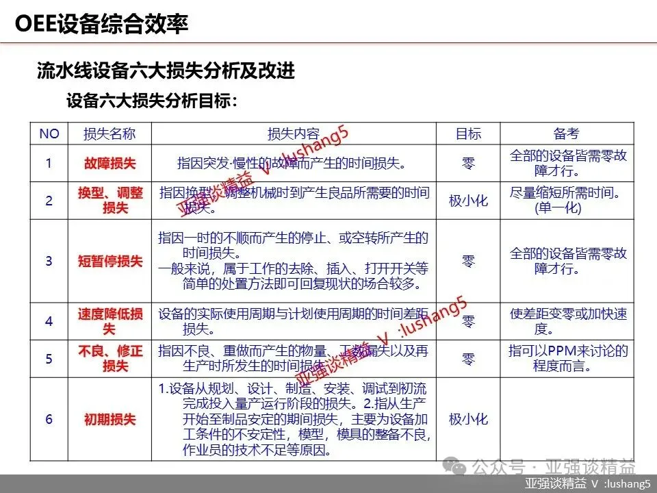 3、目前国内每个企业的OEE计算规则都会有差异性,比如那些时间是算进去的,那些不良品需要计算等等细节规则,从而导致结果千差万别。所以对标的意义不大,更多的是研究适合本公司的计算规则,将浪费暴露出来;