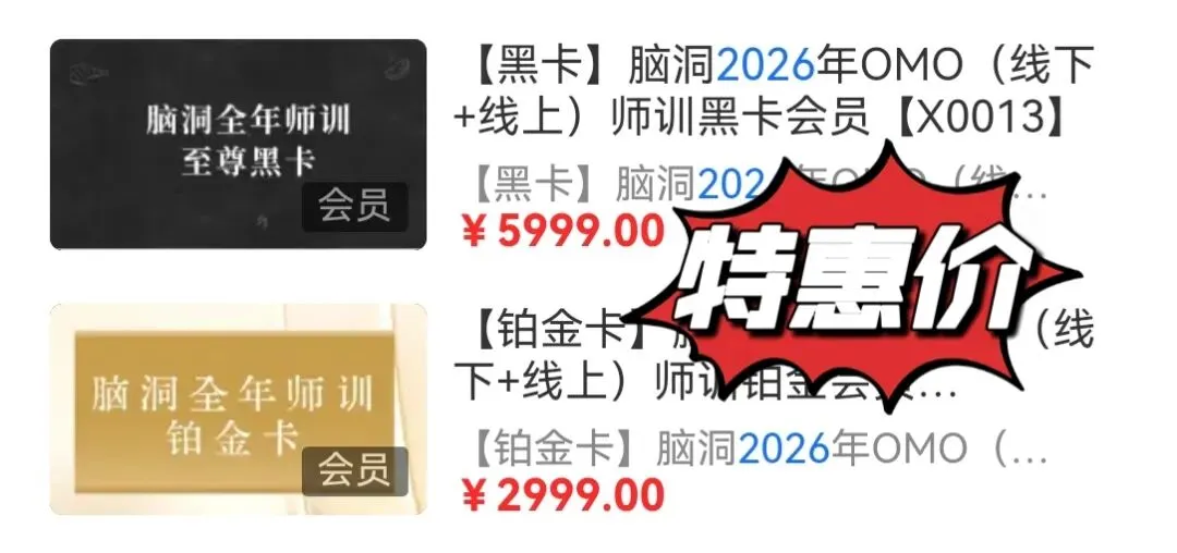 脑洞2026线下师训共包含13场,购买黑卡即可参加全部13场(同一机构可换老师参加),购买铂金卡可在13场里任选3场(限同一位老师参加)↓↓↓