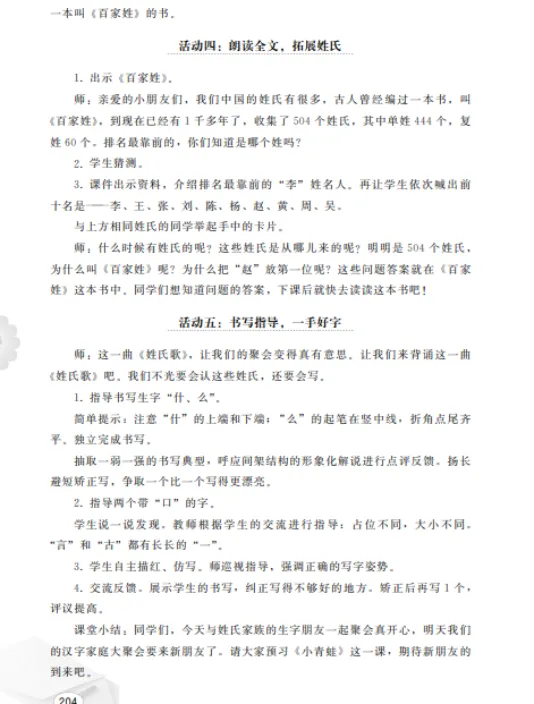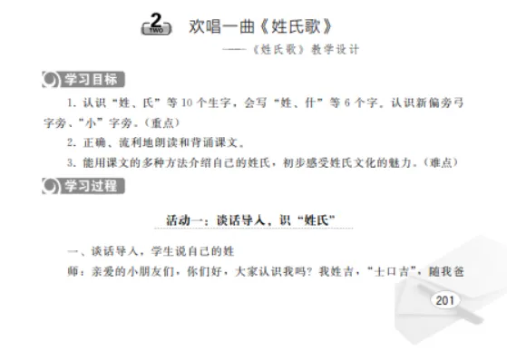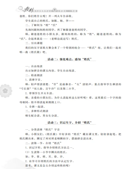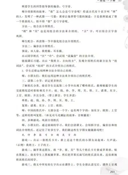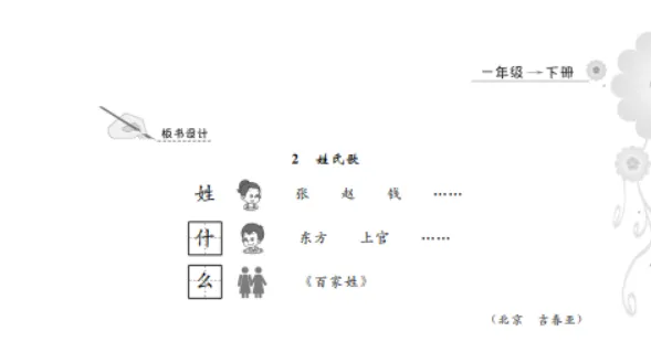在《姓氏歌》教学中,通过“弓长张”“木子李”“口天吴”等组合方式,帮助学生掌握姓氏字的构成规律,增强记忆效果。