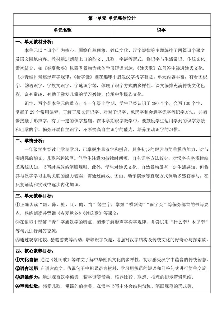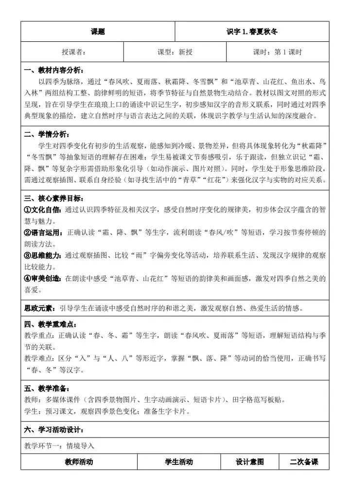 一年级下册语文《全册核心素养教案(含教学反思、二次备课栏、思政元素)》word版可编辑,高清电子版可打印