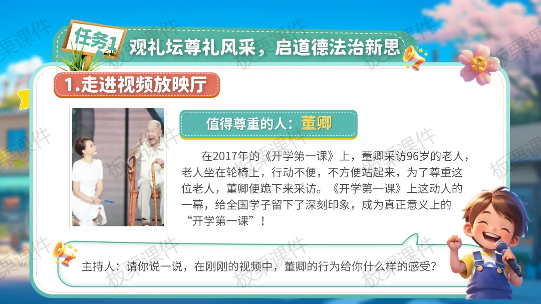 • 以 “小小少年成长营” 为情境,用董卿下跪采访的暖心视频切入,搭配情景表演、名人故事、法治讲坛等多元活动,从语言到行动,从道德到法律,层层拆解尊重的真谛。