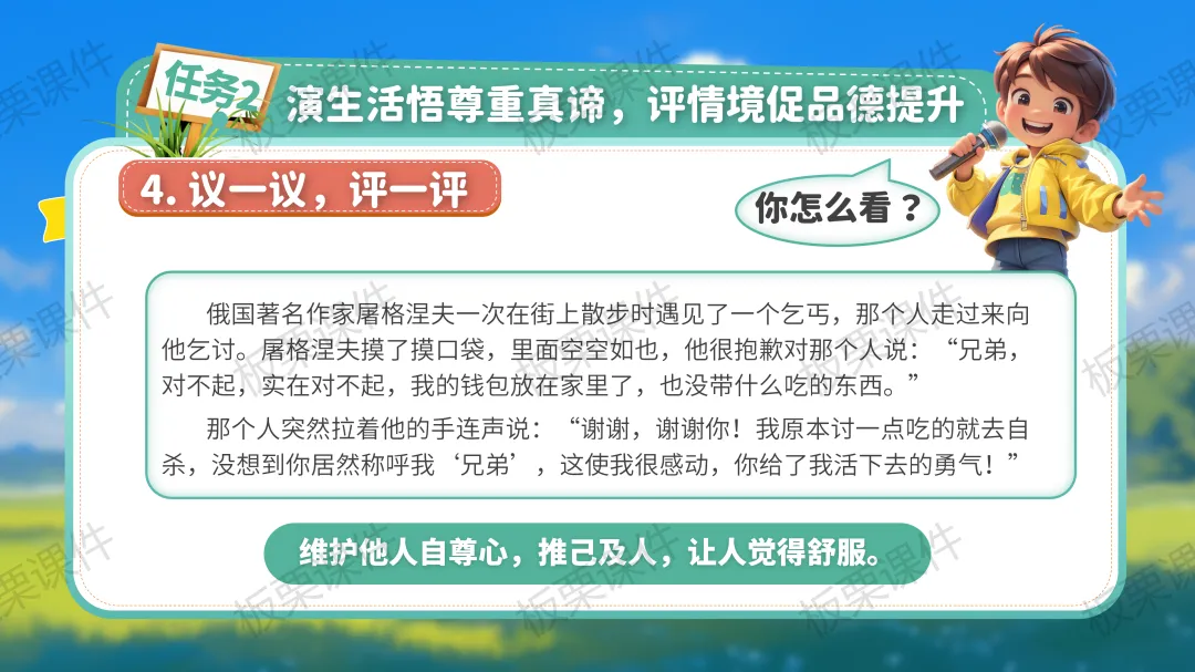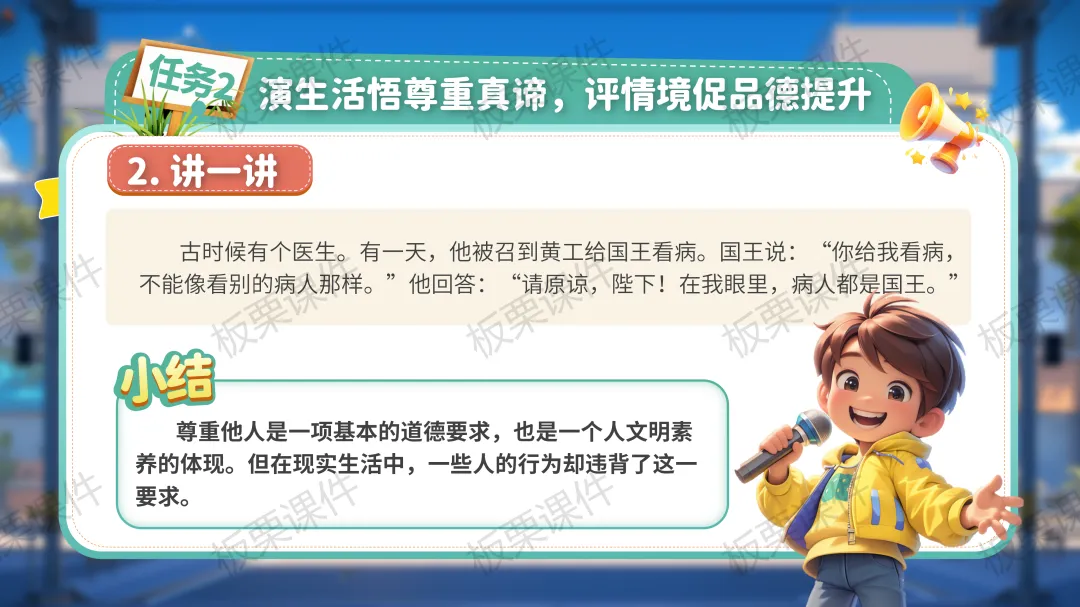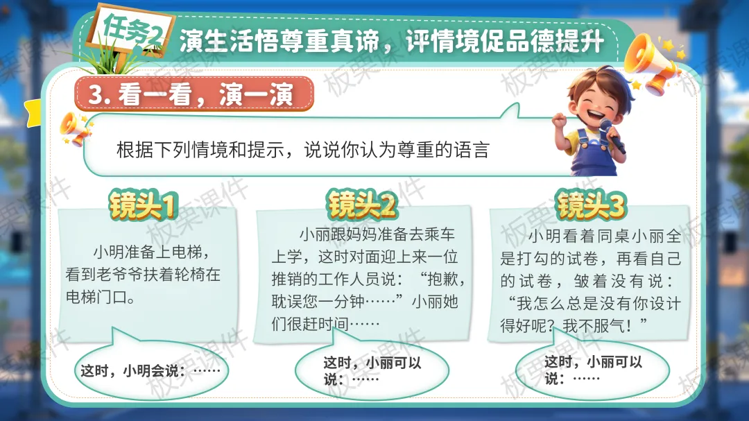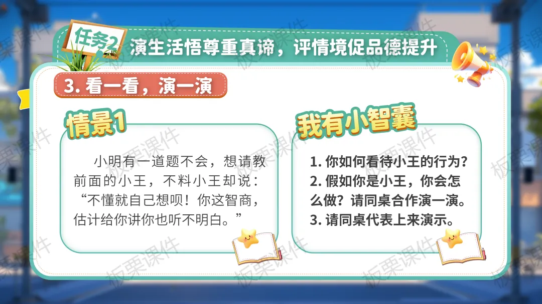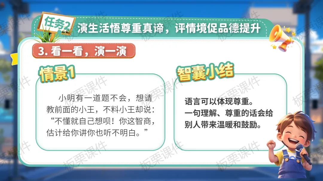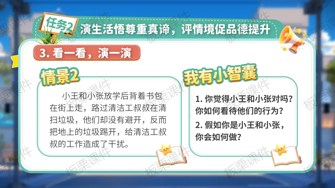 情景表演+角色扮演!《学会尊重》课件用“小明和小王”“清洁工叔叔”等生活情景,让学生演着演着就懂了丨板栗