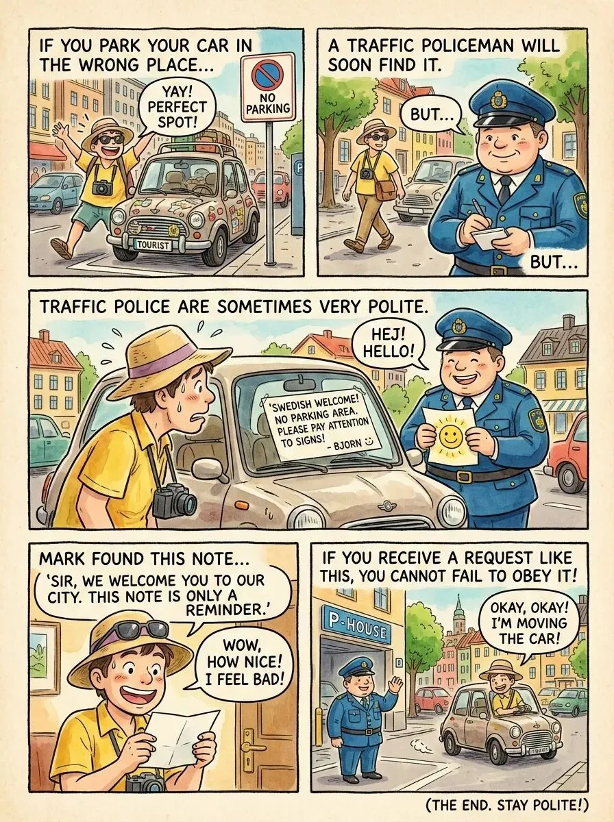 If you park your car in the wrong place, a traffic policeman will soon find it. You will be very lucky if he lets you go without a ticket. However, this does not always happen. Traffic police are sometimes very polite. During a holiday in Sweden, I found this note on my car: 'Sir, we welcome you to our city. This is a "No Parking" area. You will enjoy your stay here if you pay attention to our street signs. This note is only a reminder.' If you receive a request like this, you cannot fail to obey it!
