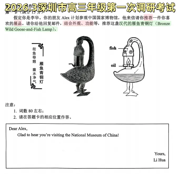 去年深圳二模的“带一件物品穿越回古代”还历历在目,今年这个“雁鱼青铜灯”充满创意,可以永远相信深圳的命题组,真的是我心目中永远的神。如果逛过国家博物馆,认真看了它的介绍或者请了专门的讲解,我觉得很容易get到这个展品的point;但是对于不太了解这个展品的同学们,我完全可以想象出你们的临场反应,尤其是文科生。