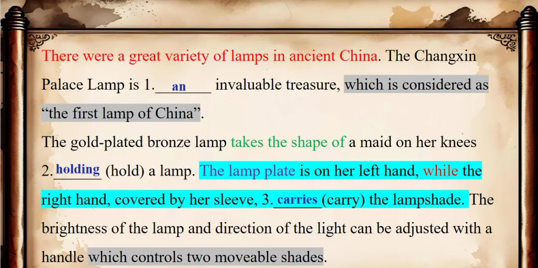 功能(环保理念)、外观(美好寓意)以及升华的点(古人智慧和精湛技艺)都了解清楚了,现在我们回到试题本身: