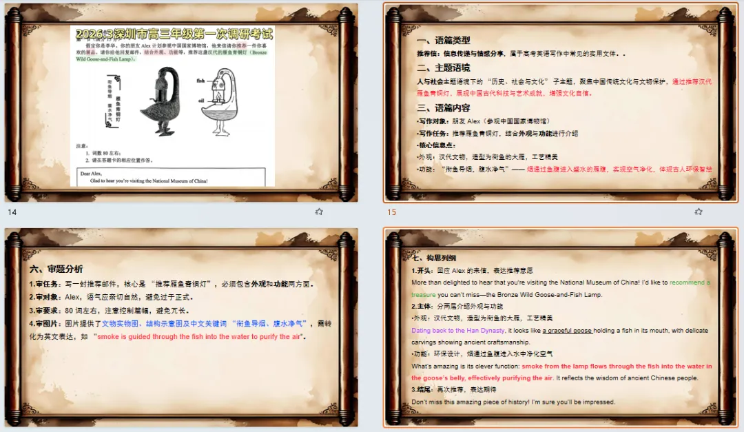 - 词汇:文物类词汇(bronze, dynasty, delicate, resourceful,purify, function 等);推荐类表达(recommend, must-see, don't miss 等)