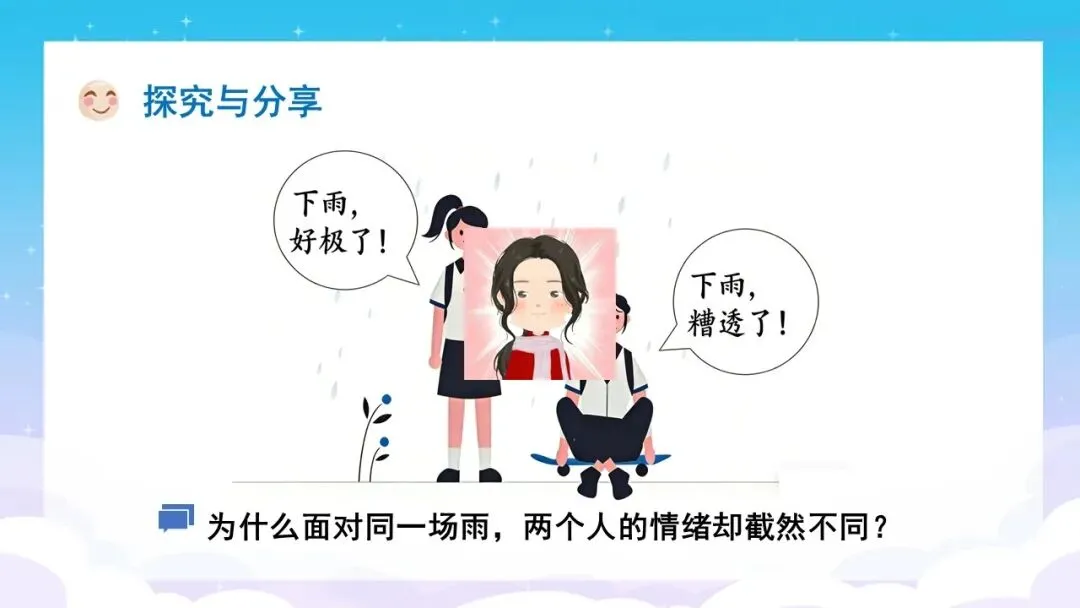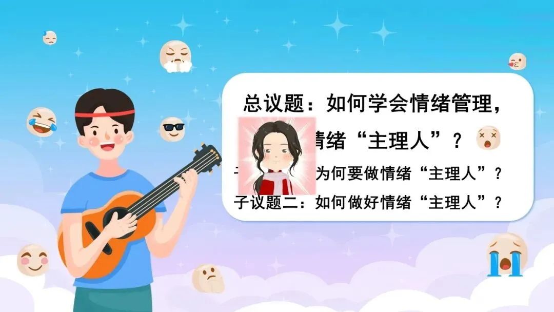 (一)导入新课。进行“情绪小测验”,展示问题:“你害怕时,会瑟瑟发抖吗?”“你高兴时,会在课堂上手舞足蹈吗?” 等,让学生快速思考并回答。引导学生初步认识到情绪管理的原因和方法,从而引出本节课主题《学会管理情绪》。(二)新课讲授。子议题一:为何要做情绪“主理人”?子议题二:如何做好情绪“主理人”?