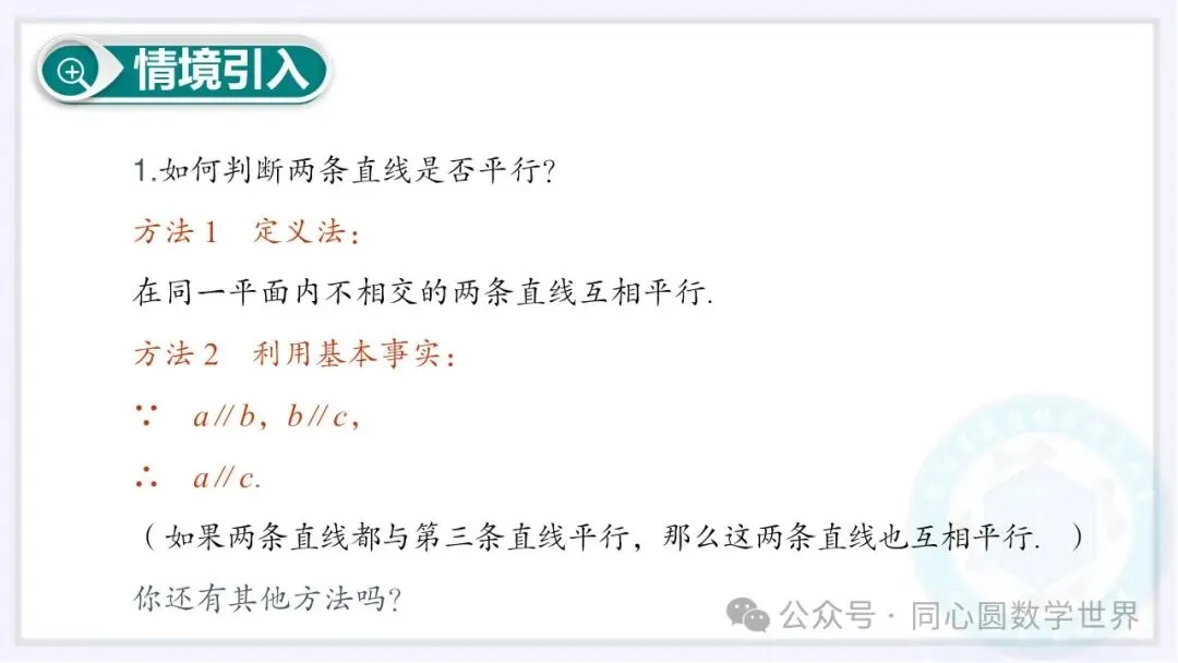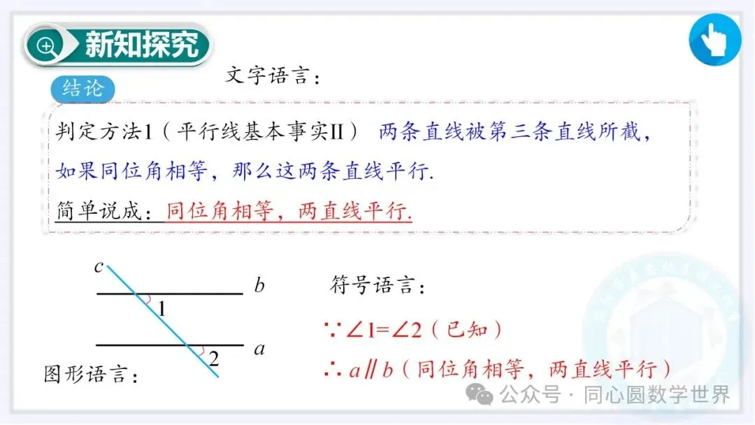 当前位置:首页>课件>人教版七年级下册数学教学课件《7.2.2.1 平行线的判定》PPT下载