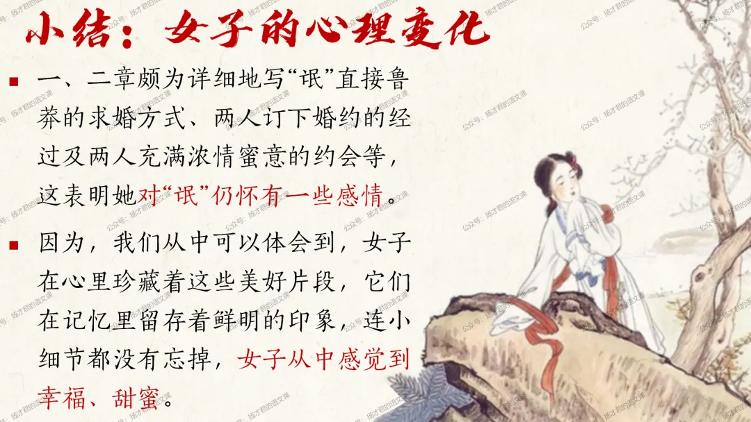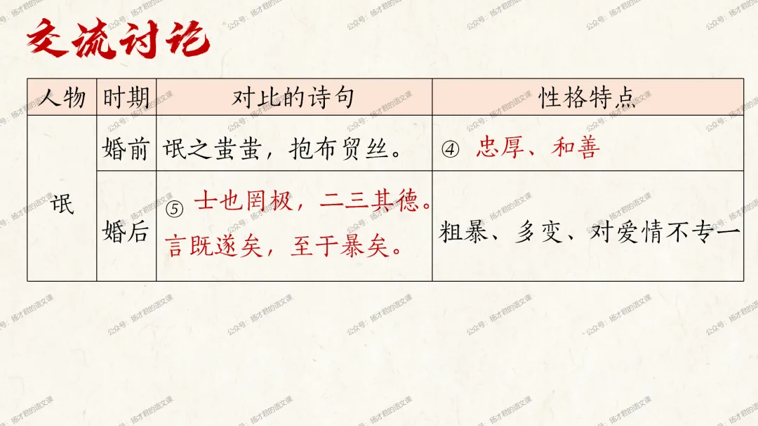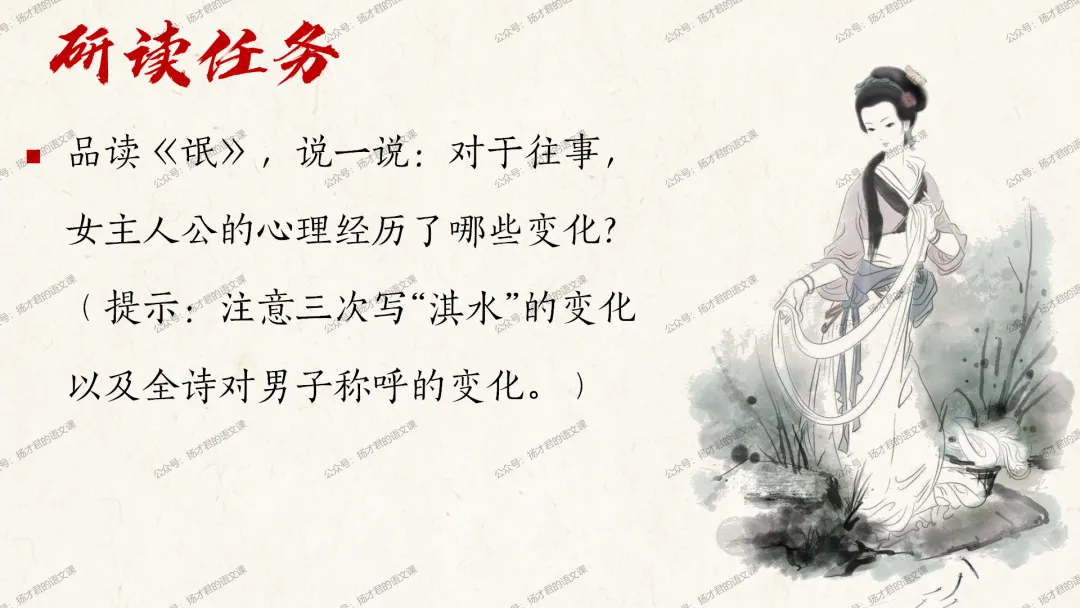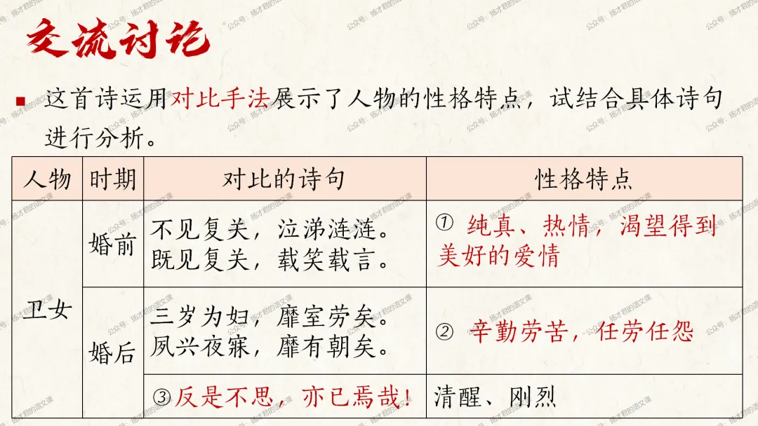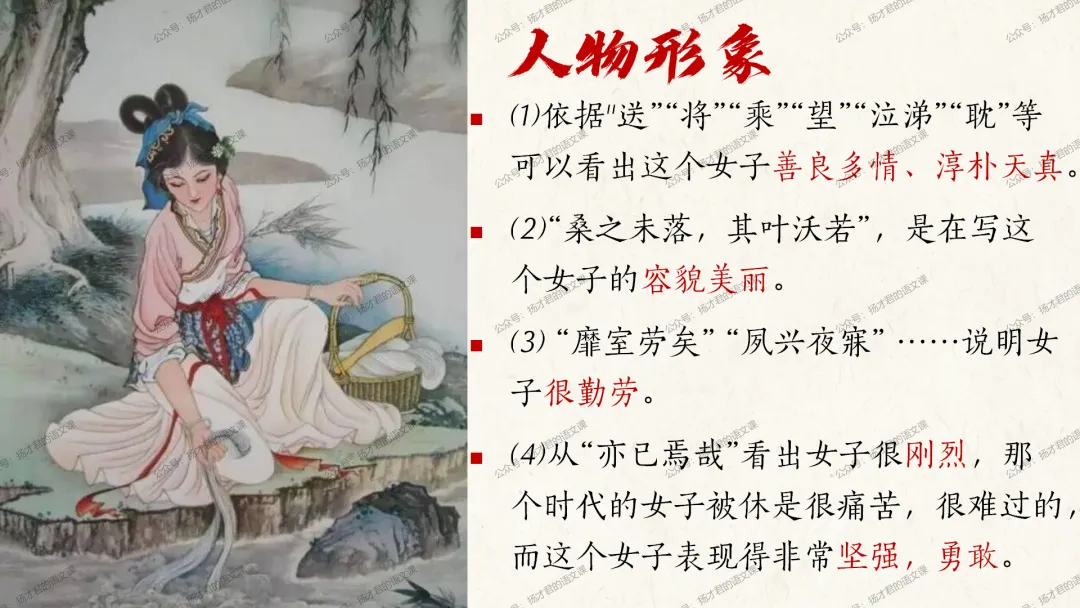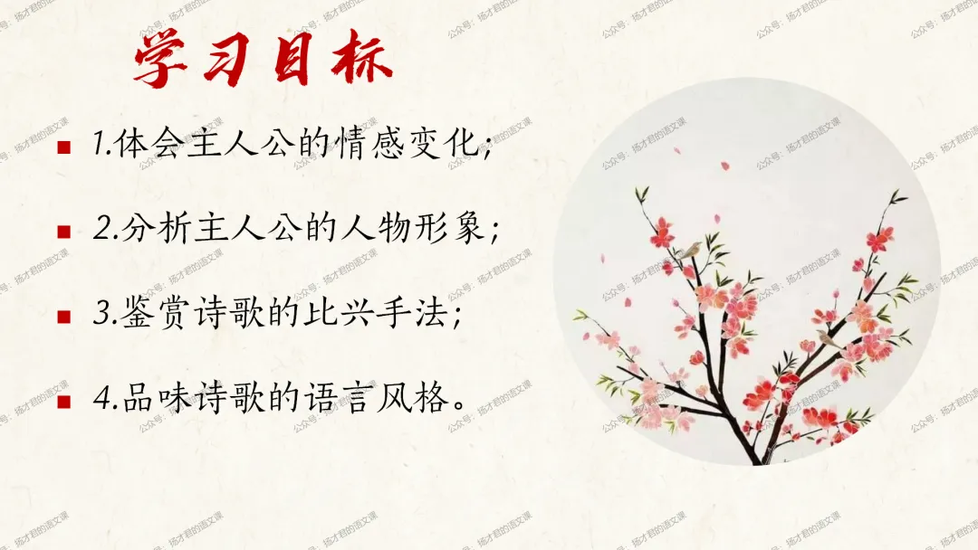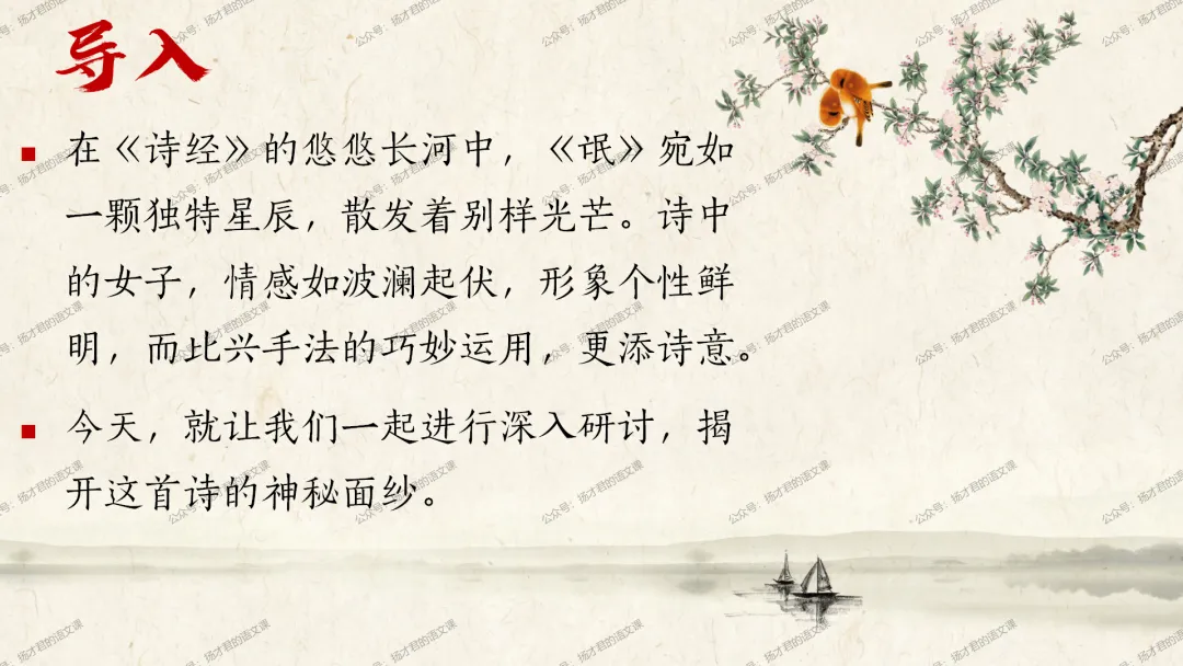 需要下载原创课件使用的老师,请直接长按下方二维码添加一个扬才君的小助手的微信,付费就可以获得下载码啦。(之前加过其他微信号的亲们,不用再加这个号了哦)下载码会在24小时内回复。多谢大家的支持!目前扬才君已经出完统编版五本书原创课件1.0版本的合集:统编版必修上,必修下,选必上,选必中,选必下。需要的老师,欢迎点击下面的链接查看哦~每一个课件都是精心设计,审美一流的,欢迎大家围观~2024-2025学年主要把高一必修上和必修下的课件进行2.0版本的更新,今年秋季学期开始,开始对选择性必修上中下的课件进行更新,温馨提示:2.0版本只是在1.0版本的基础上进行微调和补充,如果来不及等更新的亲们,之前1.0版本的课件,完全可以用哦。之前的课件质量很不错的。今天跟诸位老师分享的课件是选必下2.0版《氓》(两课时)原创课件(附教学设计)。更新的课件,思路清晰,内容充实,设计精美,希望对大家有用哦!其中研讨课的学习目标如下:1.体会主人公的情感变化;