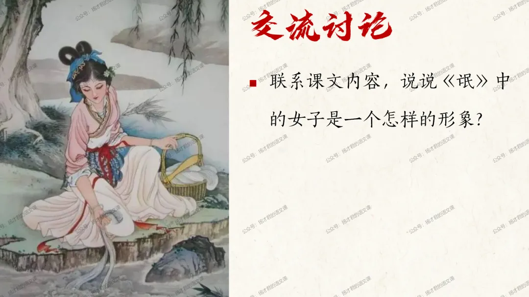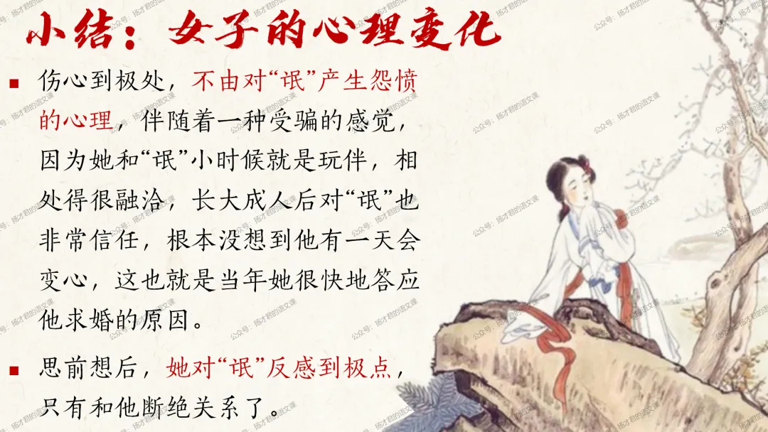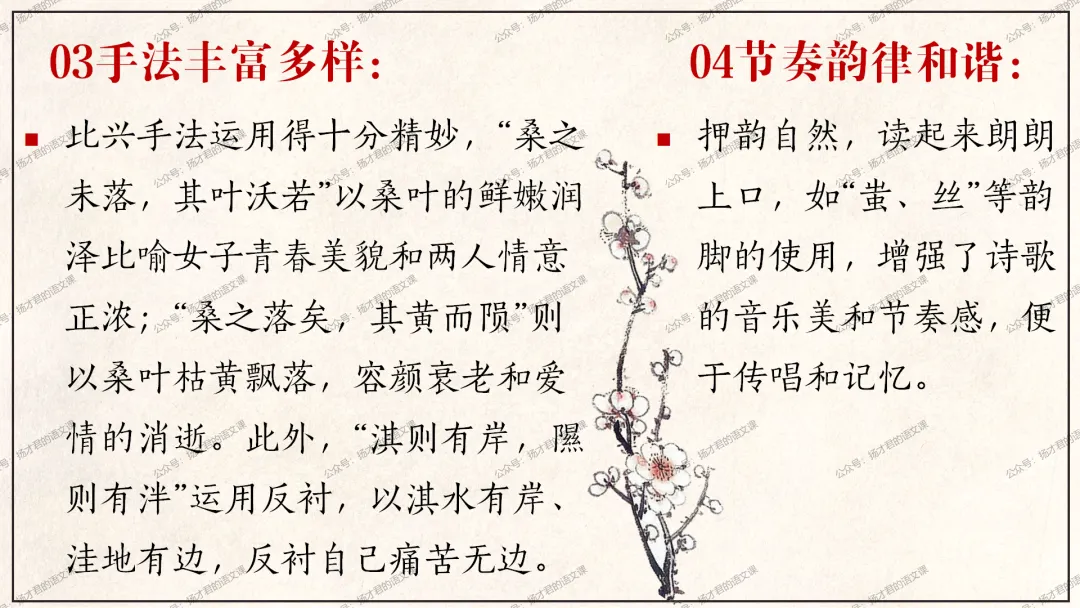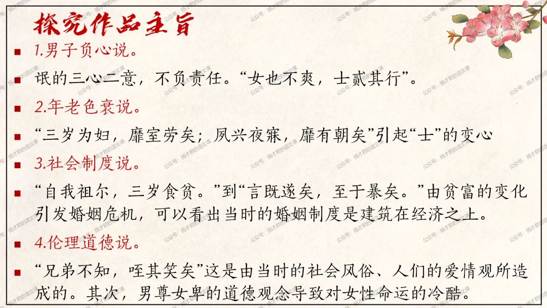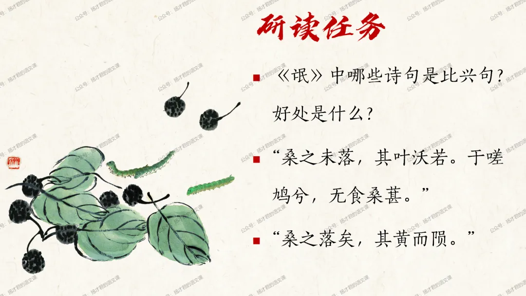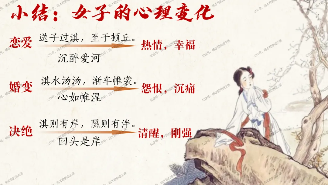 需要下载原创课件使用的老师,请直接长按下方二维码添加一个扬才君的小助手的微信,付费就可以获得下载码啦。(之前加过其他微信号的亲们,不用再加这个号了哦)下载码会在24小时内回复。多谢大家的支持!目前扬才君已经出完统编版五本书原创课件1.0版本的合集:统编版必修上,必修下,选必上,选必中,选必下。需要的老师,欢迎点击下面的链接查看哦~每一个课件都是精心设计,审美一流的,欢迎大家围观~2024-2025学年主要把高一必修上和必修下的课件进行2.0版本的更新,今年秋季学期开始,开始对选择性必修上中下的课件进行更新,温馨提示:2.0版本只是在1.0版本的基础上进行微调和补充,如果来不及等更新的亲们,之前1.0版本的课件,完全可以用哦。之前的课件质量很不错的。今天跟诸位老师分享的课件是选必下2.0版《氓》(两课时)原创课件(附教学设计)。更新的课件,思路清晰,内容充实,设计精美,希望对大家有用哦!其中研讨课的学习目标如下:1.体会主人公的情感变化;