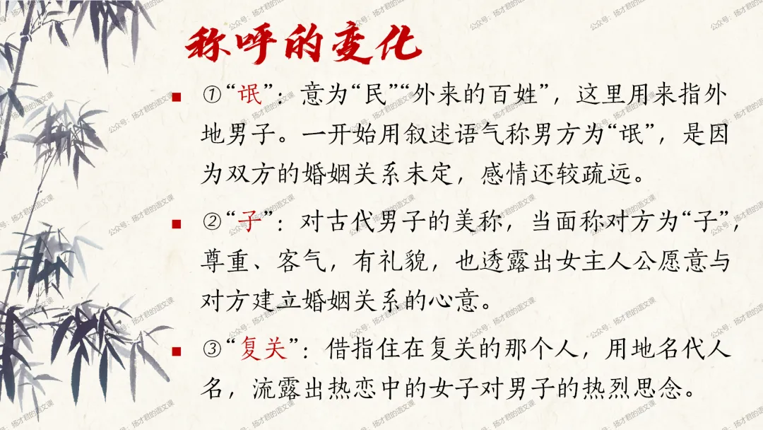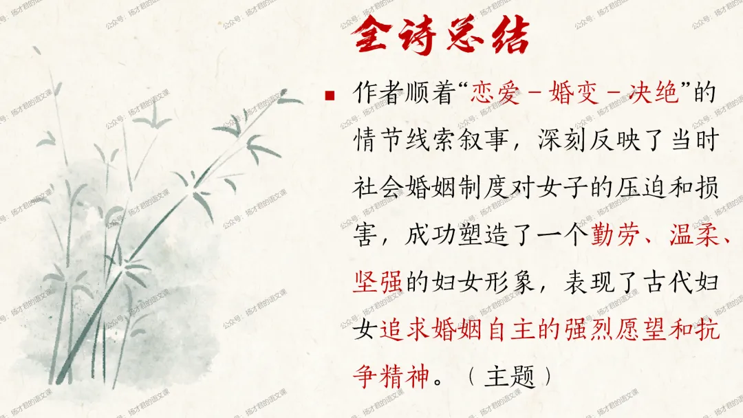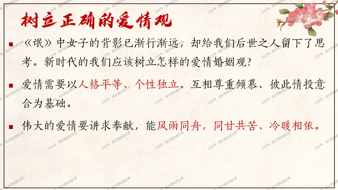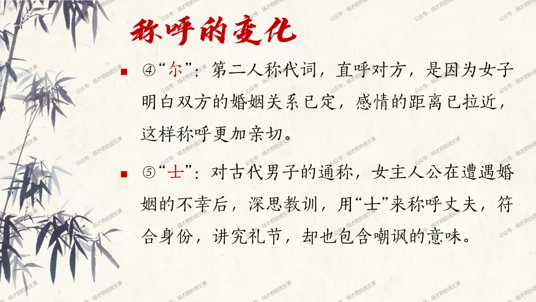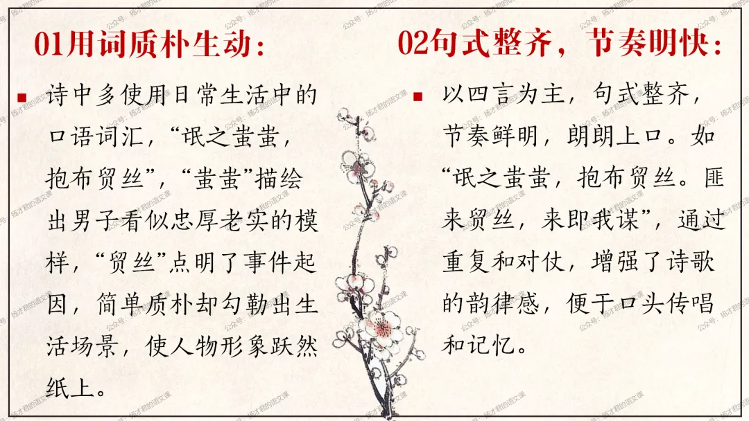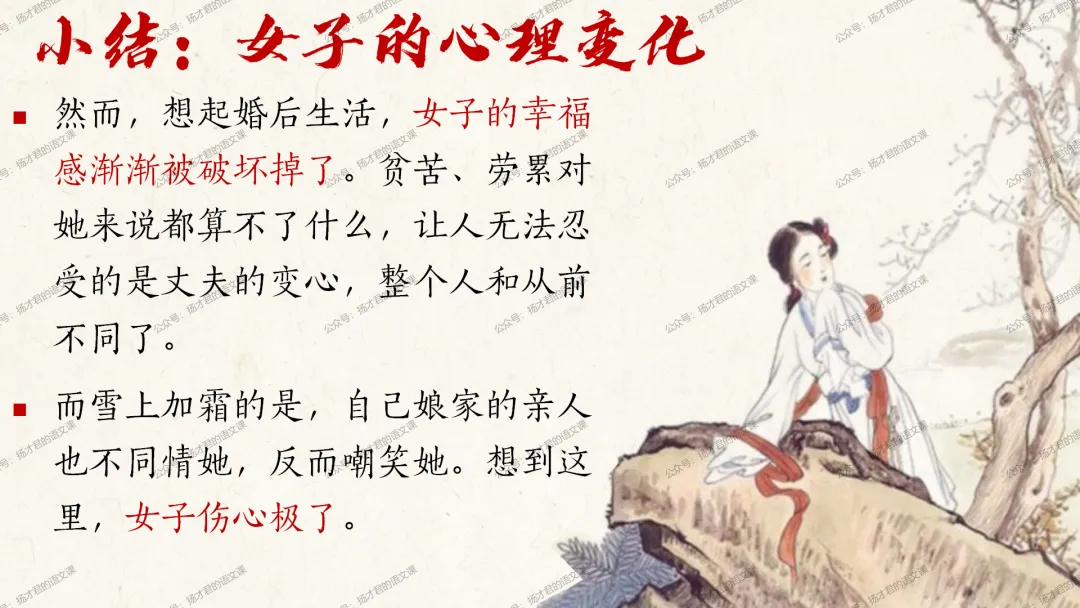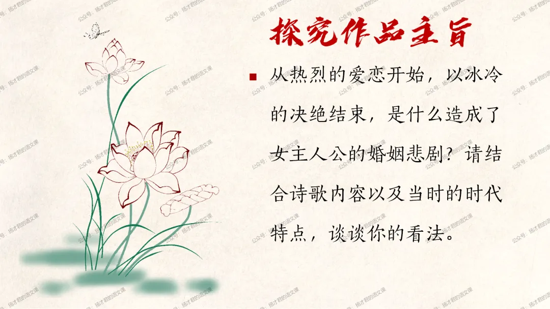 需要下载原创课件使用的老师,请直接长按下方二维码添加一个扬才君的小助手的微信,付费就可以获得下载码啦。(之前加过其他微信号的亲们,不用再加这个号了哦)下载码会在24小时内回复。多谢大家的支持!目前扬才君已经出完统编版五本书原创课件1.0版本的合集:统编版必修上,必修下,选必上,选必中,选必下。需要的老师,欢迎点击下面的链接查看哦~每一个课件都是精心设计,审美一流的,欢迎大家围观~2024-2025学年主要把高一必修上和必修下的课件进行2.0版本的更新,今年秋季学期开始,开始对选择性必修上中下的课件进行更新,温馨提示:2.0版本只是在1.0版本的基础上进行微调和补充,如果来不及等更新的亲们,之前1.0版本的课件,完全可以用哦。之前的课件质量很不错的。今天跟诸位老师分享的课件是选必下2.0版《氓》(两课时)原创课件(附教学设计)。更新的课件,思路清晰,内容充实,设计精美,希望对大家有用哦!其中研讨课的学习目标如下:1.体会主人公的情感变化;