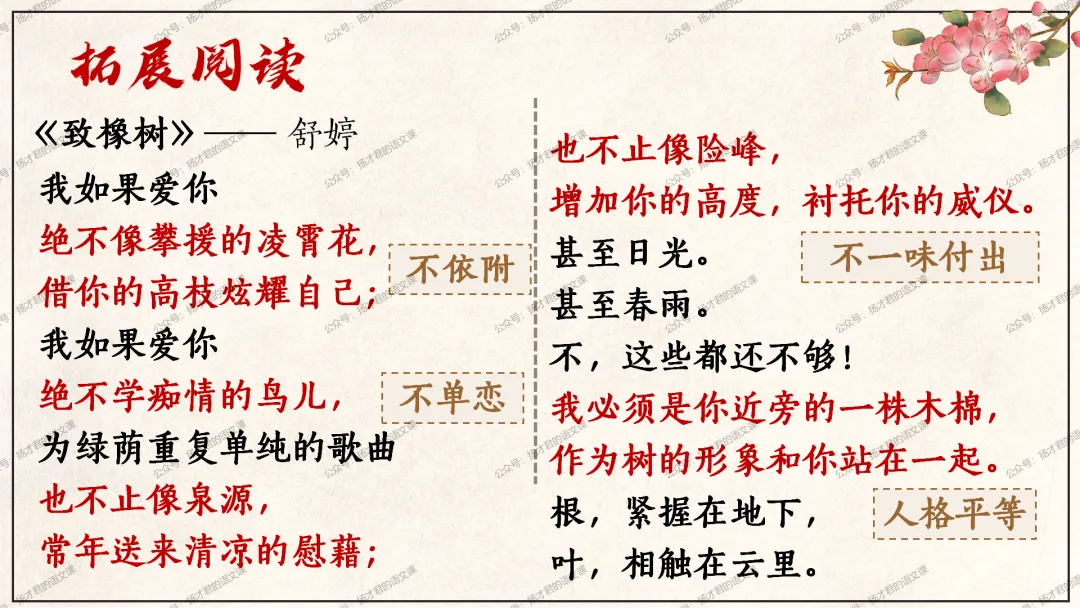 课件内容充实,从设计到打磨都花了很长时间,而且购买后课件logo可删,也可以自己编辑修改,喜欢的话,欢迎下载,多多交流;如果自己不是语文老师,也欢迎转发文章给身边那些美美的语文老师哦!感恩亲们的支持!下面是研讨课课件页面预览(本课件为原创付费课件,课件已申请版权保护,请大家尊重知识产权,切勿传播,侵权必究,感恩您的理解):课件配图源于网络,若无意侵犯了您的版权,请及时和我们联系,我们一定会妥善处理。由于课件是使用WPS制作的,所以大家最好用WPS打开哦。而且为了保证大家在教室的电脑也能够显示出字体和动画效果,所以PPT嵌入了一些字体,大家下载打开的时候,多一些耐心哈。需要必修上、必修下、选必上、选必中和选必下五本书课件合集的老师,点击下面图片可跳往查看哦:需要下载原创课件使用的老师,请直接长按下方二维码添加一个扬才君的小助手的微信,付费就可以获得下载码啦。(之前加过其他微信号的亲们,不用再加这个号了哦)下载码会在24小时内回复。多谢大家的支持!喜欢公众号的话,欢迎点亮在看,欢迎把公众号的文章转发到朋友圈,转发语文群,让更多的语文人知道我们。真心感激不尽!