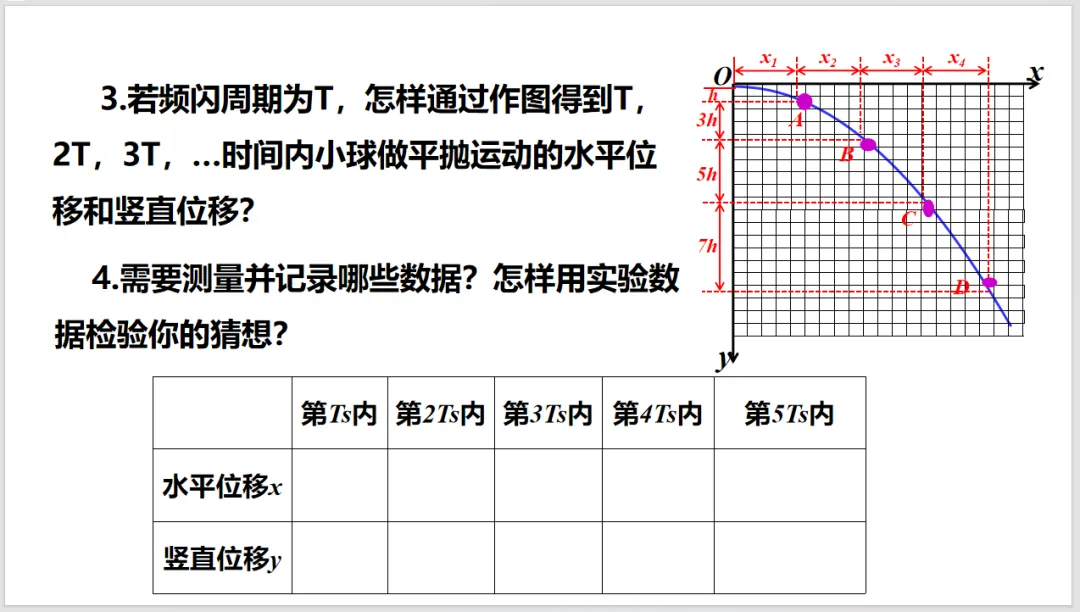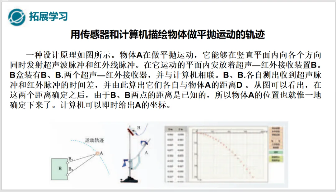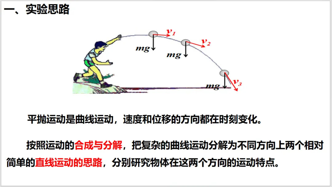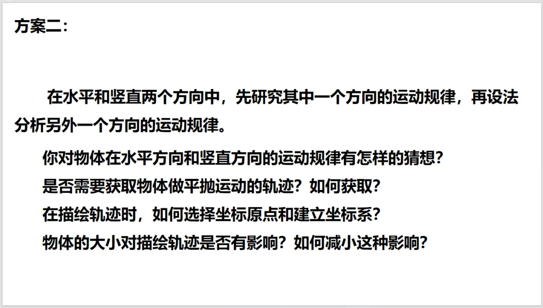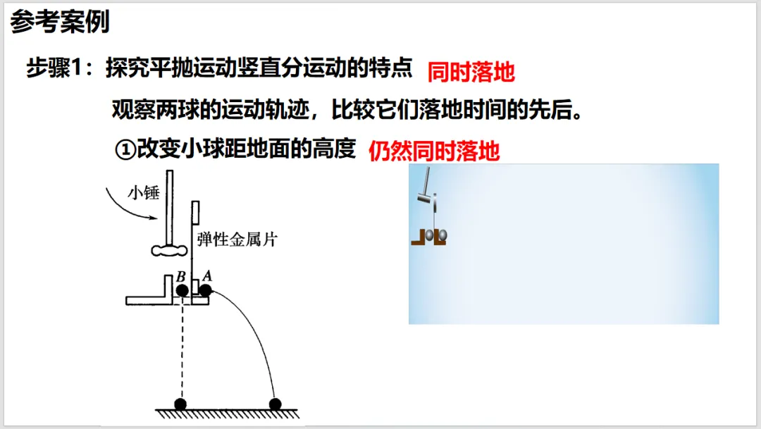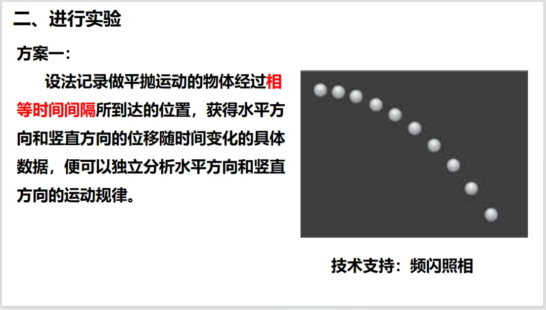 本节实验属于探究性实验,而不是验证性的。在这一节中,要求会用运动的合成与分解的方法分析抛体运动。教材中采用了先理论分析探究平抛运动的实验方法和实验思路,再分两个步骤做实验。首先是先研究竖直方向的特点,在获得结论之后,利用竖直方向做自由落体运动的结论,进一步探究平抛体在水平方向运动的特点。这样处理,有利于学生形成正确的逻辑思维。探究的过程既有实验现象的观察,又有分析、推理的过程,还要将实验现象与分析、推理结合起来。实验的手段上既有传统的仪器演示实验,也介绍了使用频闪照相技术等。