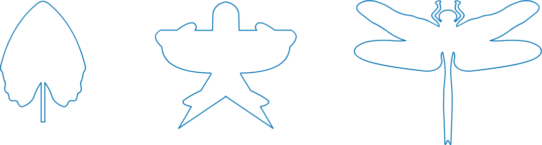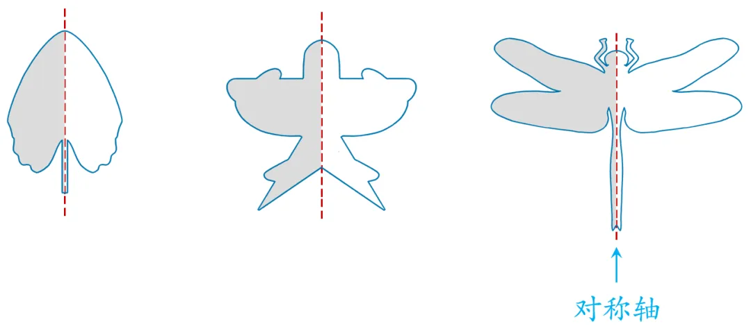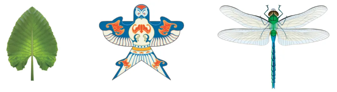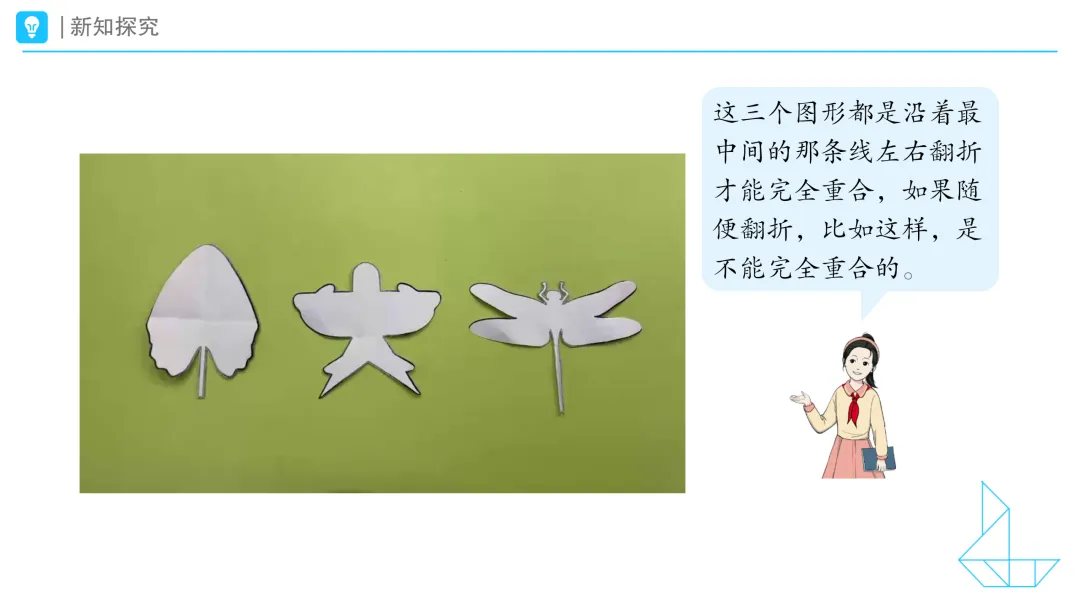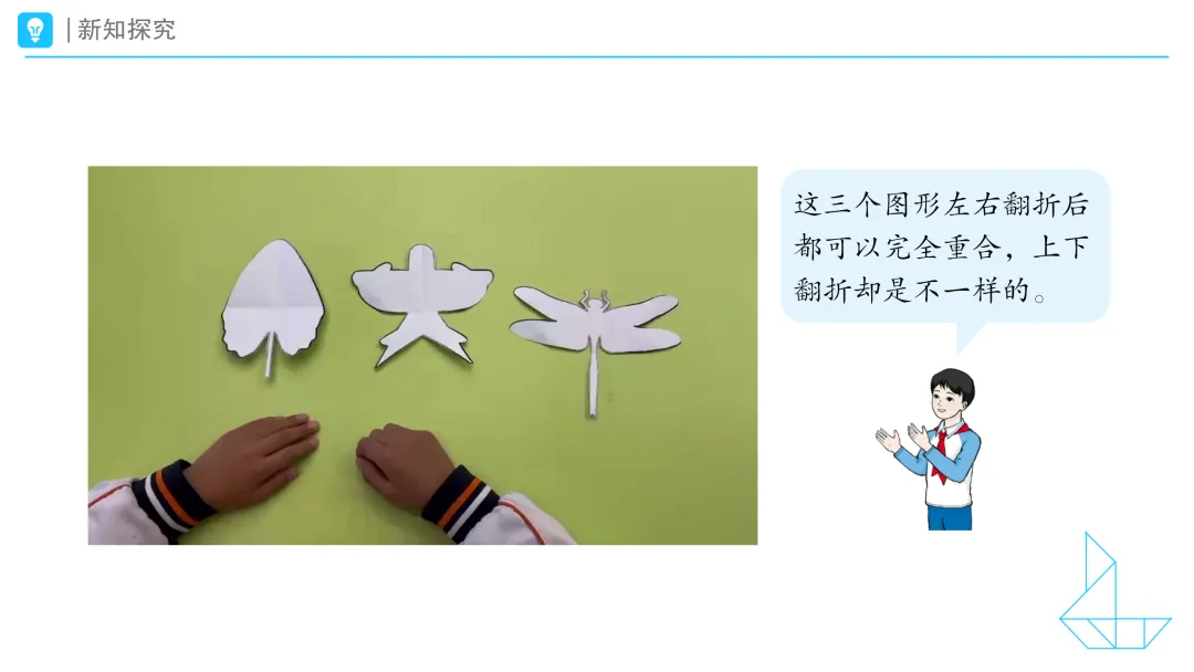 预设1:我发现,把叶子的图形像这样从右边翻折到左边,两边会重合。但是,把叶子的下面翻折到上面,却不会重合。 预设2:我也是这样折的。我把燕子风筝的图形像这样从右边翻折到左边,左右两边是一样的,而从上面翻折到下面,上下两面是不一样的。 预设3:我对折了蜻蜓图案,也发现左右对折后,两边会重合,上下翻折却不会重合。 预设4:我发现这三个图形左右翻折后都可以完全重合,上下翻折却是不一样的。 预设5:我发现这三个图形都是沿着最中间的那条线翻折才能左右两边完全重合,如果随便翻折,比如这样,是不能完全重合的。 提问:同学们,你们也有这些发现吗?这些图形都是对称的。 课件出示: