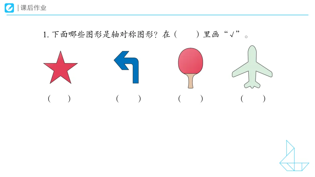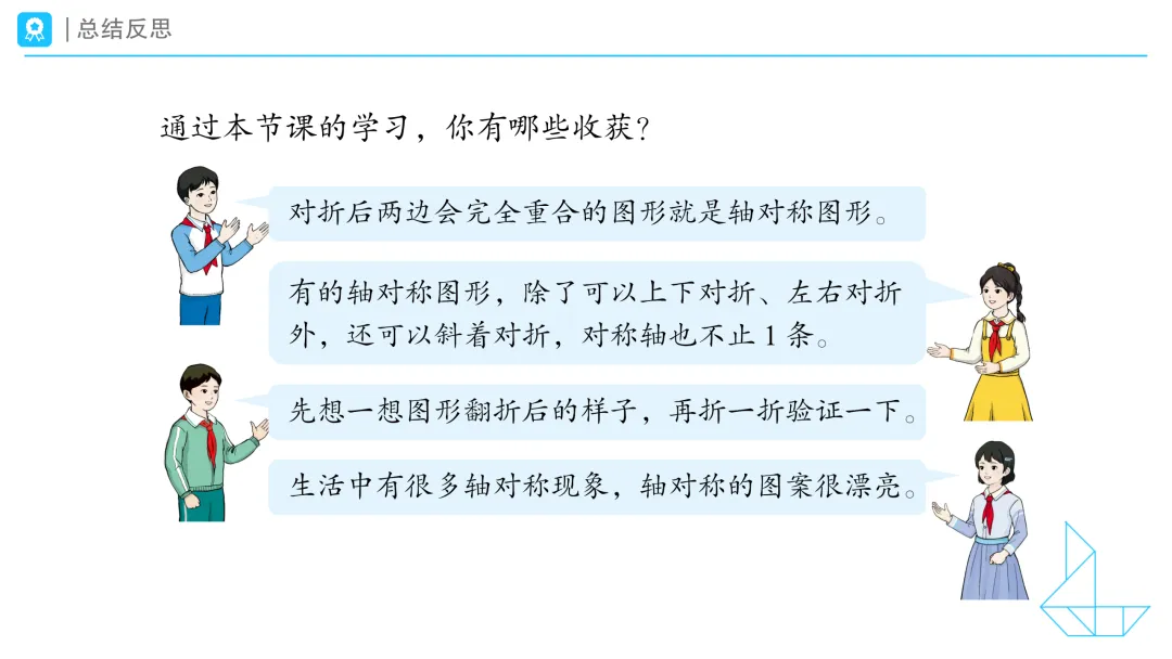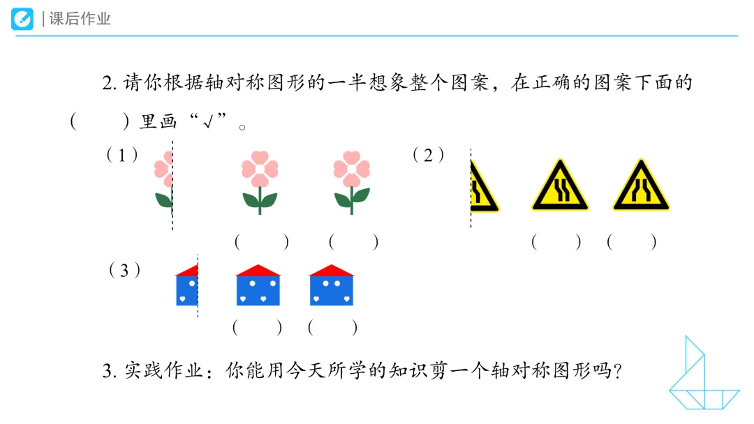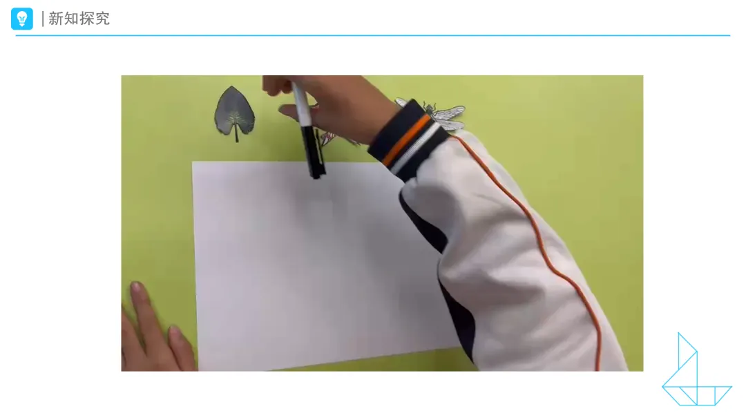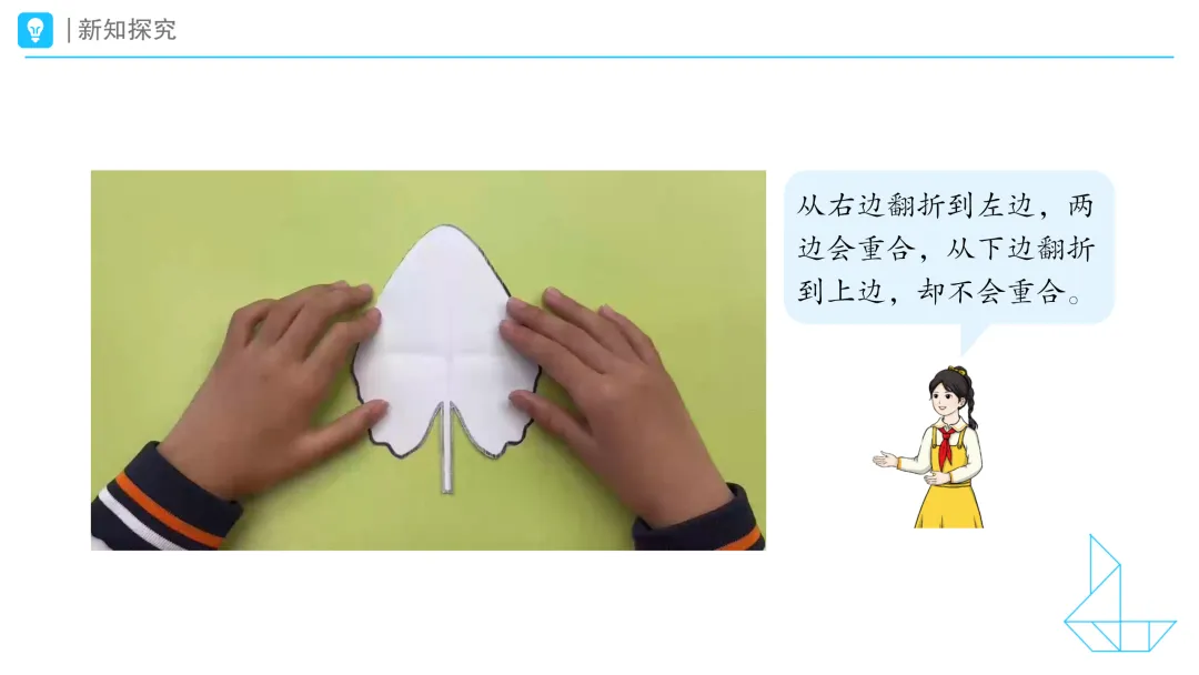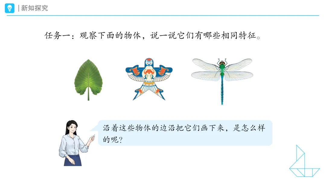 1.提问:请看大屏幕,观察这些物体,说一说它们有哪些相同特征。拿出学习任务单,自己先想一想,然后和你的小伙伴说一说你的想法。 预设1:我发现叶子的左右两边是一样的。 预设2:我也发现风筝和蜻蜓的左右两边是一样的。 2.提问:同学们,课前我们试着沿着这些物体的边沿,把它们画了下来,你是这样画的吗?(课件出示学生操作视频) 二、动手操作:初步发现轴对称图形的特征 1.课件出示任务二:折一折,你发现了什么?把你的发现和你的小伙伴们说一说。