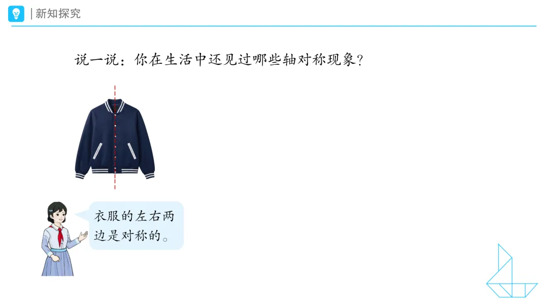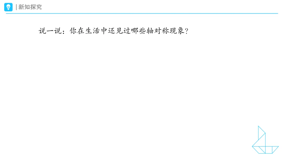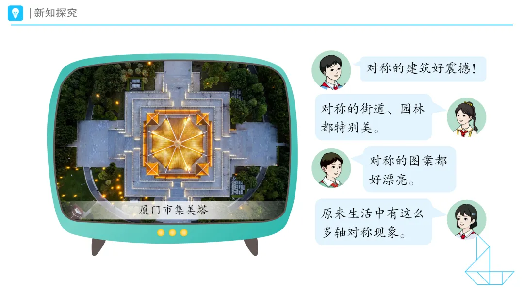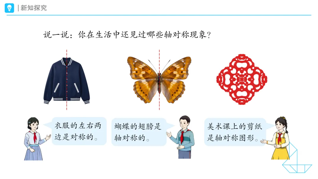 小结:它们沿着一条线对折,图形两边能完全重合。像这样,对折后能完全重合的图形就是轴对称图形,对折的这条线就是对称轴。 2.说一说生活中的轴对称现象 提问:你在生活中还见过哪些轴对称现象? 预设1:我发现衣服的左右两边是对称的。 预设2:我发现蝴蝶的翅膀是轴对称的。 预设3:我发现美术课上的剪纸是轴对称图形。 小结:同学们都有善于发现的慧眼!在我们的生活中还有许多轴对称现象,瞧!(课件出示生活中轴对称现象的视频) 提问:看完视频,你们有什么感受? 预设1:对称的建筑好震撼。 预设2:对称的街道、园林都特别美。 预设3:原来生活中有这么多轴对称现象。 三、实践探知:深入理解轴对称图形的特征 提问:现在,你会辨别轴对称图形吗? 课件出示任务三:下面哪些图形是轴对称图形?