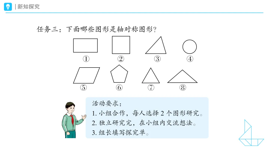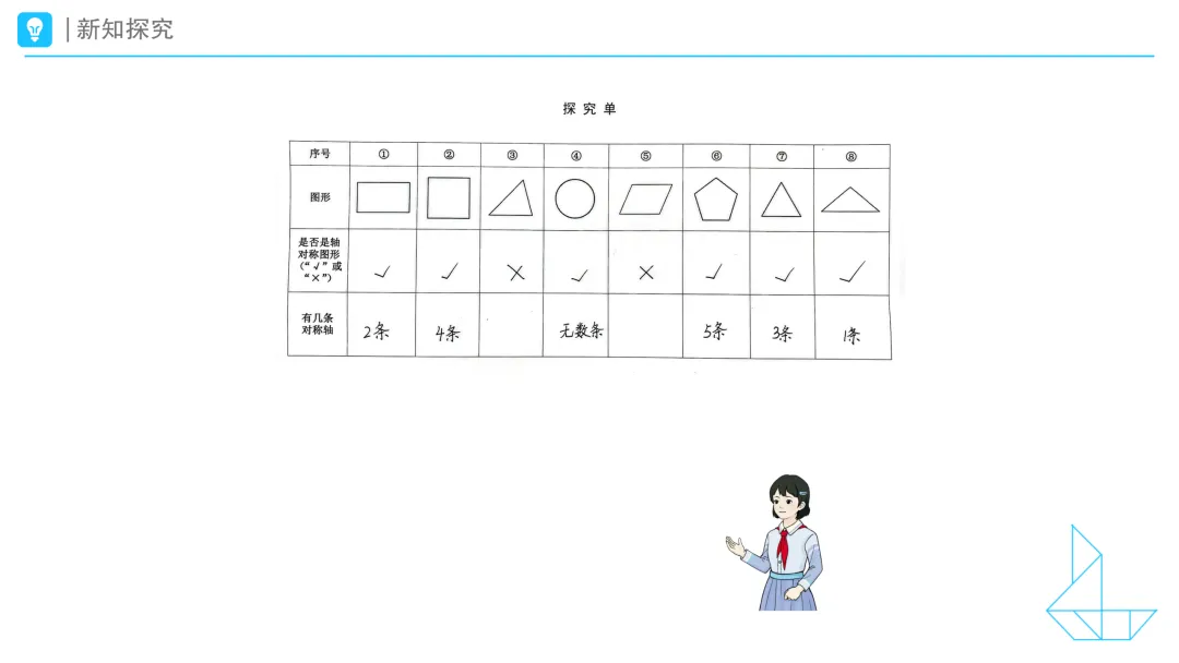 拿出2号学具袋的探究单和图形动手试一试吧。 预设1:通过研究,我们发现③号和⑤号不是轴对称图形。我们先看③号三角形,把它这样翻折,两边不会完全重合,这样翻折两边也不会完全重合,这样翻折,两边还是不会完全重合。所以它不是轴对称图形。再看⑤号平行四边形。我们发现,把平行四边形左右翻折,两边不会完全重合,上下翻折两边仍然不会完全重合,这样斜着翻折,不会完全重合,这样斜着翻折还是不会完全重合。所以平行四边形不是轴对称图形。 预设2:我研究的是①号长方形和②号正方形。我发现长方形和正方形都是轴对称图形。把长方形和正方形上下对折,两边图形会完全重合,左右对折,两边图形也会完全重合。正方形还可以这样斜着对折,两边会完全重合;再这样斜着翻折,两边也会完全重合。所以,长方形有2条对称轴,正方形有4条对称轴。 预设3:④号和⑥号图形都是轴对称图形。我们先来看④号圆形,通过对折,我发现,这样对折,圆的两边会完全重合,这样对折,两边同样完全重合,这样对折,两边还是完全重合。不管朝着哪个方向对折,圆的两边始终完全重合。所以圆有无数条对称轴。再看⑥号图形,我发现可以这样对折,图形两边会完全重合,可以这样对折,两边完全重合,这样对折、这样对折、这样对折,两边都是完全重合的,所以⑥号图形有5条对称轴。 预设4:我研究的⑦号、⑧号这2个三角形。通过对折,发现左右对折后,这两个三角形的两边都会完全重合。但是⑦号三角形这样斜着对折两边也会完全重合,⑧号三角形这样斜着翻折后,两边不能完全重合。⑦号三角形还可以这样斜着对折,两边也会完全重合,⑧号三角形这样斜着翻折后不能完全重合。所以⑦号三角形有3条对称轴,而⑧号三角形只有1条对称轴。 预设5:我认为长方形还有两条斜着的对称轴。你们看,这条斜着的线(对角线)把长方形分成两部分,两部分是一样的呀,所以这条线是对称轴。另外一条斜线也可以把长方形分成一样的两部分,也是长方形的对称轴。 预设6:我不同意前一位同学的想法。如果把长方形沿着斜着的这条线(其中一条对角线)剪下来,再转一下,两部分是一样的。但是确定是不是对称轴是看沿着这条线对折,两边会不会完全重合,并不是剪下来比较。我们沿着长方形的这条线(其中一条对角线)对折,两边是不会完全重合的,所以这条线不是对称轴;沿着另外一条线(另一条对角线)对折,两边也不会完全重合,这条线也不是对称轴。所以长方形只有两条对称轴。 预设7:我有补充,平行四边形也是一样的,沿着斜着的这条线分成两部分,这两部分是一样的,但是沿着这条线对折,折痕的两边是不会完全重合的,这样看这个图形就不是轴对称图形,折痕也不是对称轴。所以,判断一个图形是不是轴对称图形,不是看分成的两部分图形是不是一样,而是对折,看看两边能不能完全重合。 小结:谢谢同学们的精彩汇报,通过对折活动,同学们不但知道了哪些图形是轴对称图形,还数出了轴对称图形的对称轴数量,真是善于发现和总结。今天我们认识了轴对称现象,接下来就让我们一起来检验检验今天的学习成果吧。 |