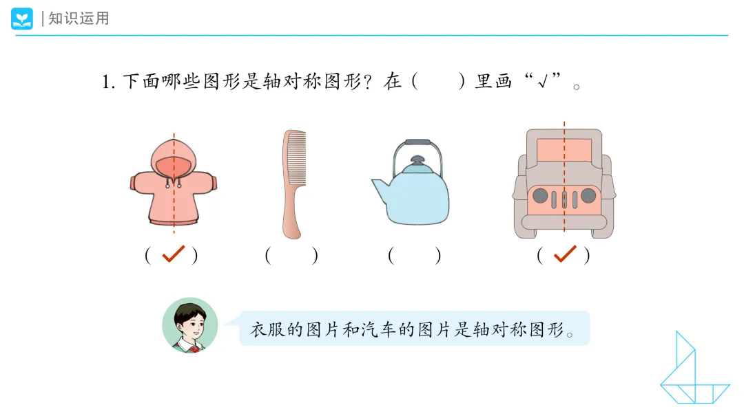 一、观察发现:初步感知生活中的对称现象 课件出示任务一:观察下面的物体,说一说它们有哪些相同特征。