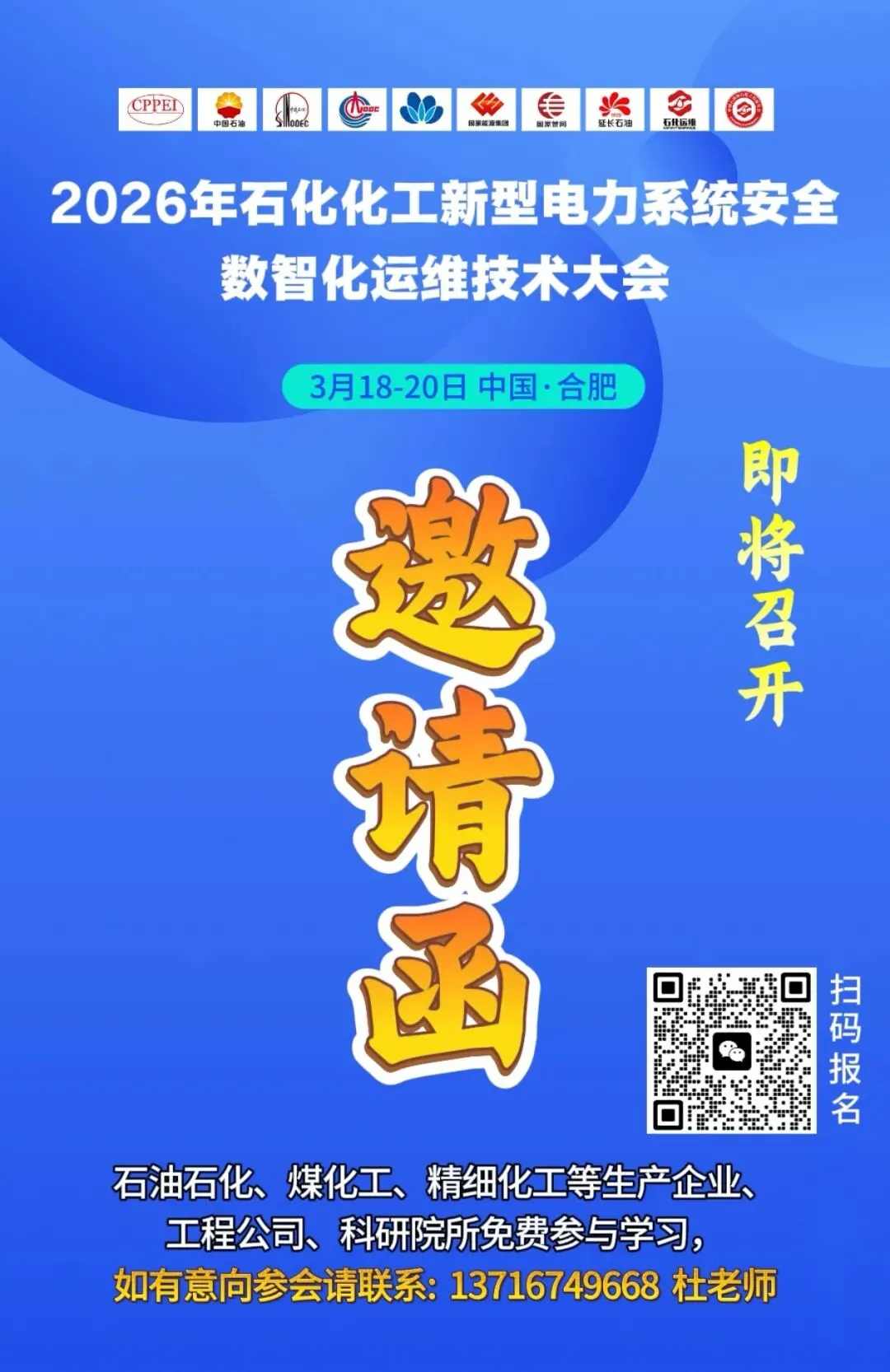 2026年石化化工新型电力系统安全数智化运维技术大会 (3月18-20日 合肥 即将召开),诚邀石油石化行业有新技术、新设备的企业参与大会的演讲/展台/参会,石油化工、煤化工、化工等生产企业免会议费、如有意向请尽快来电报名:13716749668 杜老师