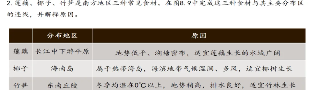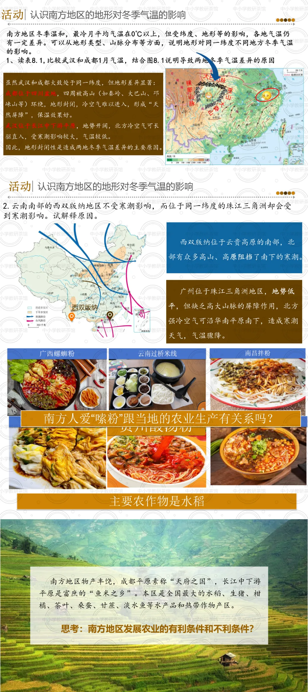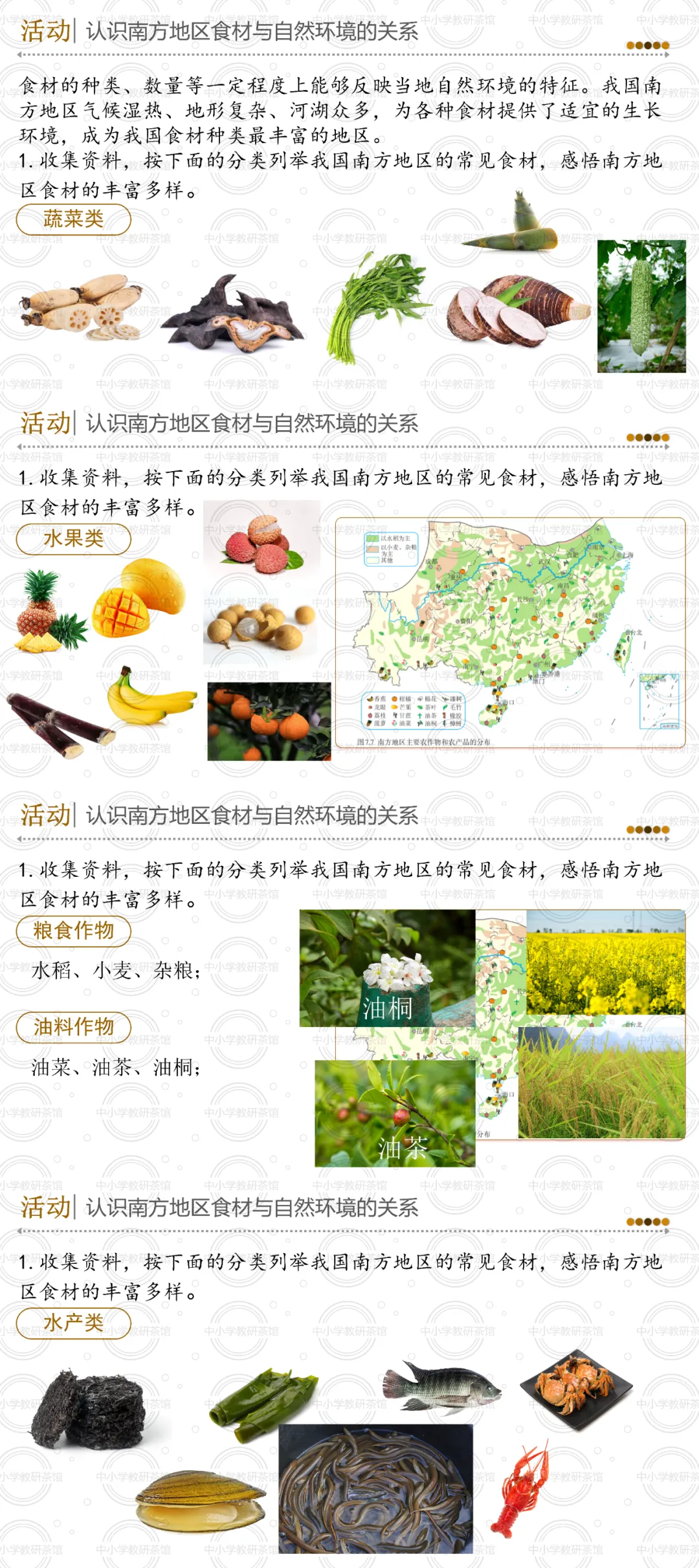 好处:课件没有将“自然特征”和“农业”割裂开来,而是通过逻辑串联(如从地形气候讲到土壤植被,再讲到农业特点与食材分布),帮助学生理解地理要素之间的内在联系。