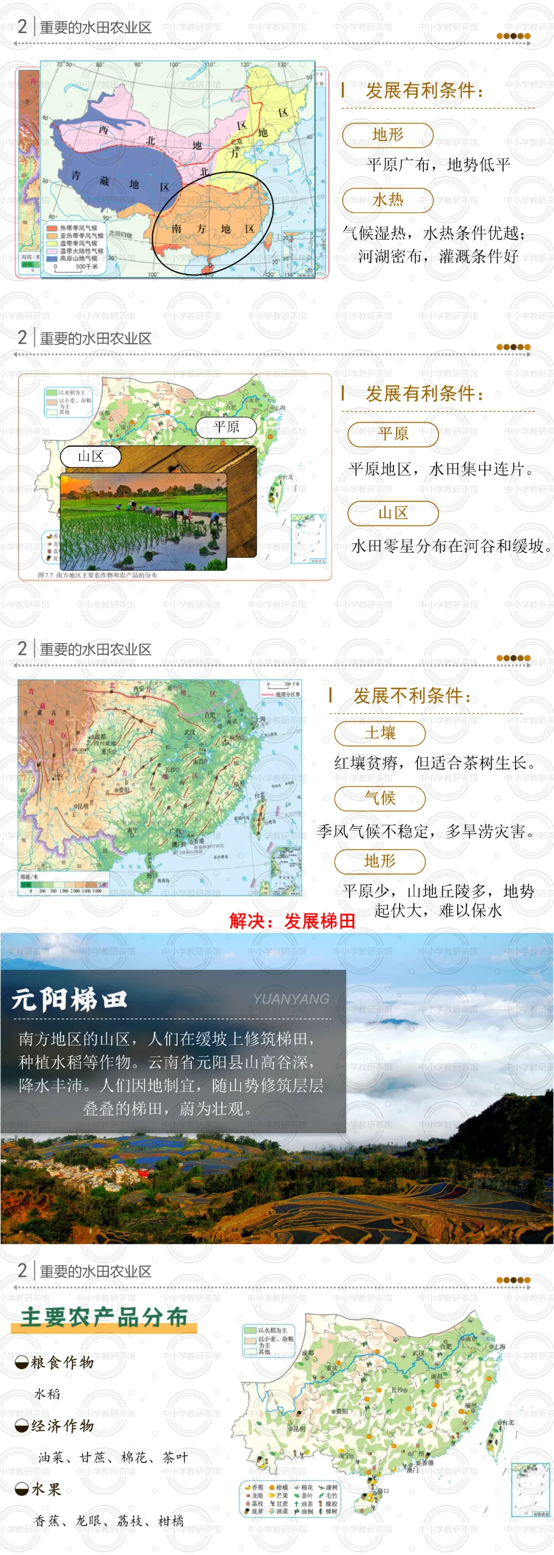 地理新教材人教版八年级下册8.1《自然特征与农业》这堂主题是《南方地区自然特征与农业》,采用了大单元教学的设计思路,将原本可能分散的知识点(位置、地形、气候、土壤、农业、人文)有机整合在一起。这种课件设计对于教学和学生学习有以下几方面的好处: