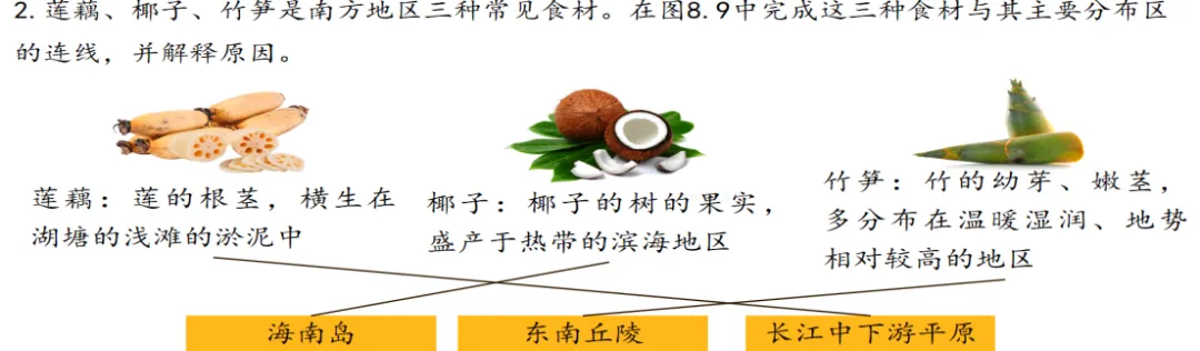 示例:通过“嗦粉”引出主要农作物是水稻,通过三种食材分布连线题,让学生主动去匹配气候与地形特征。