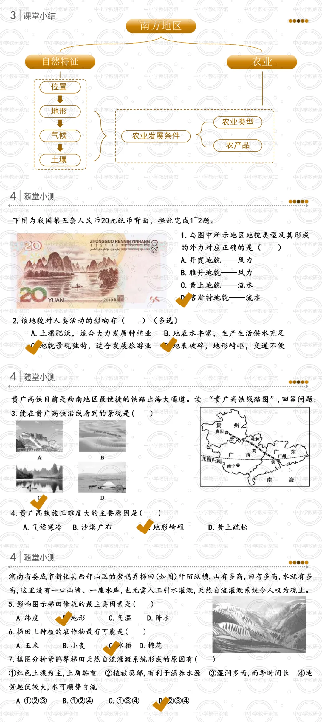 示例:利用20元人民币背面图案引出喀斯特地貌,利用贵广高铁线路图分析施工难度,都是对图文转换能力的训练。