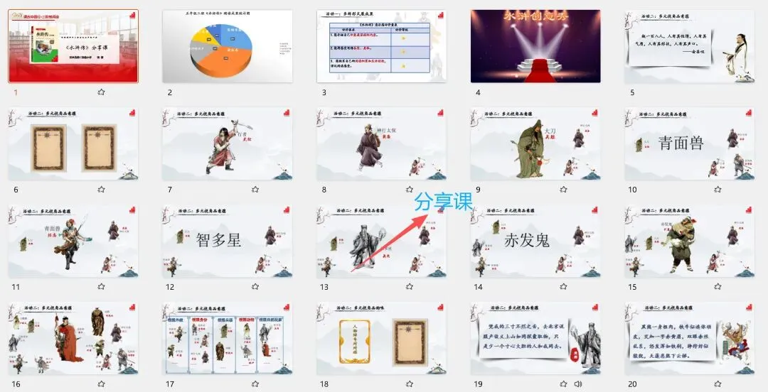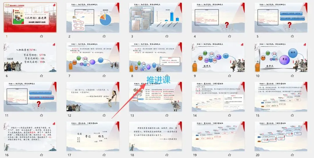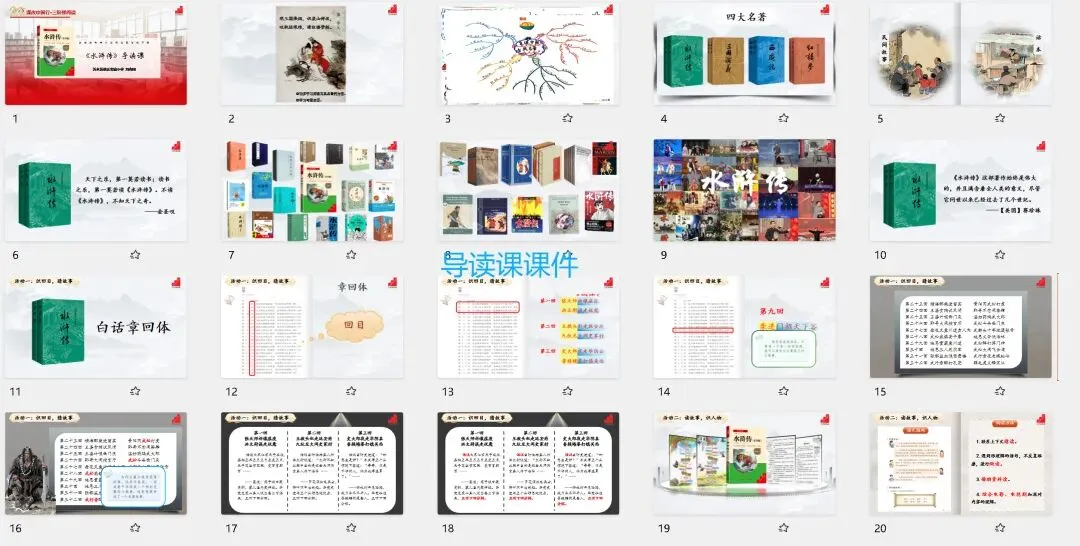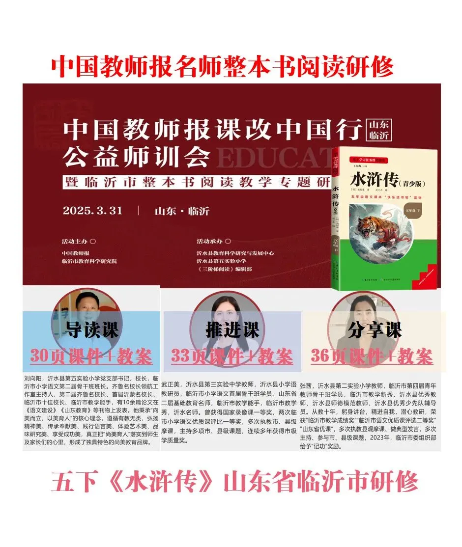 🌼由中国教师报组织,课改中国行整本书阅读研修——山东临沂市《水浒传》整本书阅读。🌻名师执教课例,有导读,推进,分享三种课型,课件精美,手把手教学的整本书阅读课例。🛍️课件➕教学设计,电子版均可编辑,上图为预览。