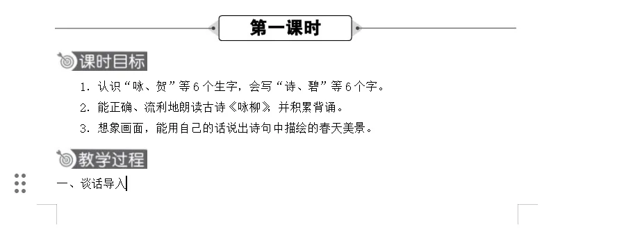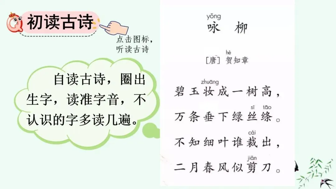 1.认识“咏、贺”等11个生字,会写“诗、碧”等8个字,积累“贺、丝”等生字拓展的词语。