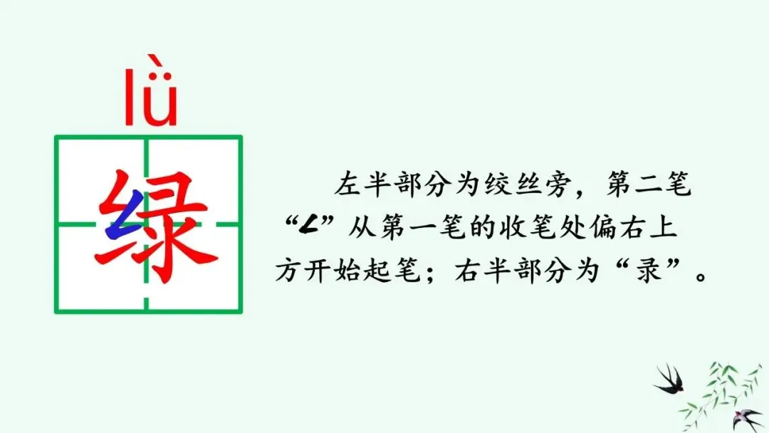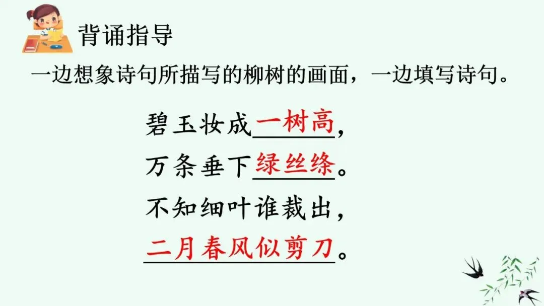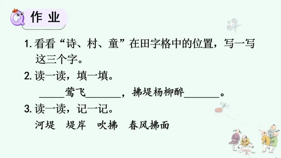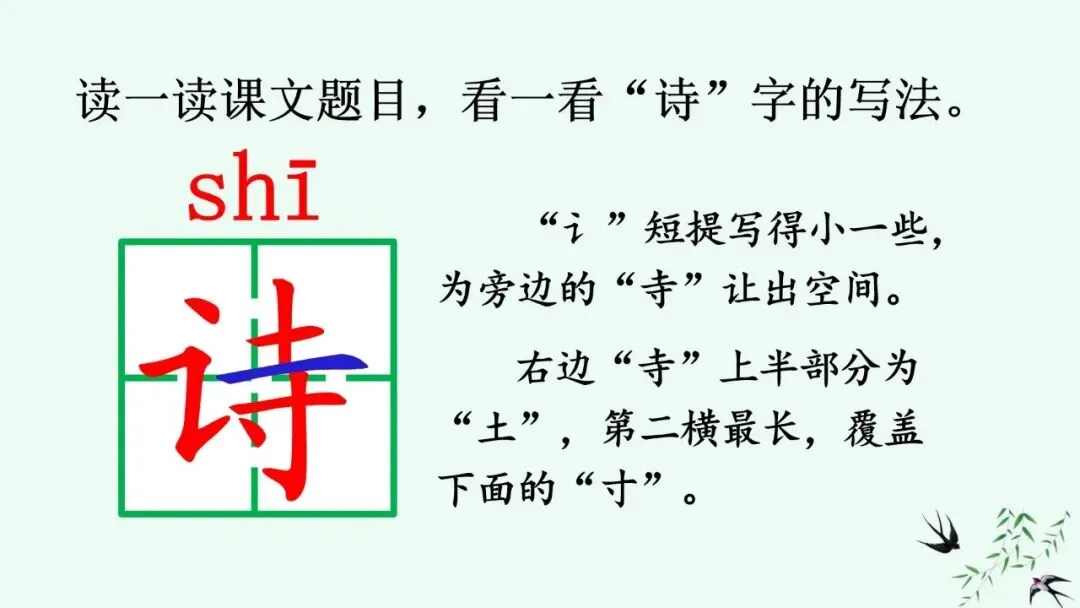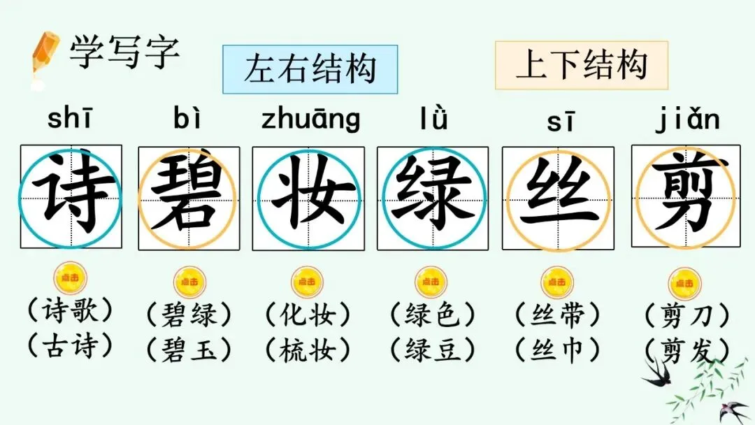 关注写字:此课的8个会写字中,“诗、妆、绿、归”是左右结构,书写时要注意左窄右宽,其中“绿”的最后四笔为“点、提、撇、捺”;“碧、丝、剪、童”是上下结构,要注意上下两部分的比例,要写得端正、平稳。此课要求写的字,可以和熟字组成常用词语识记。