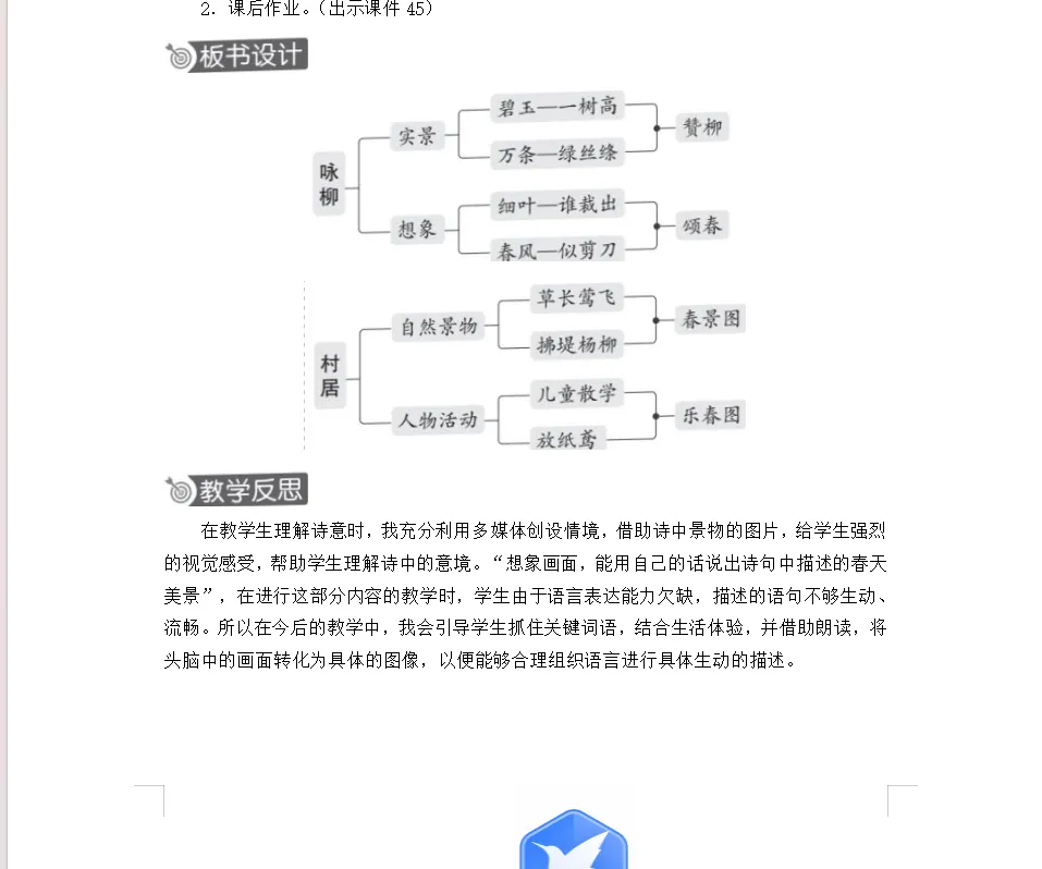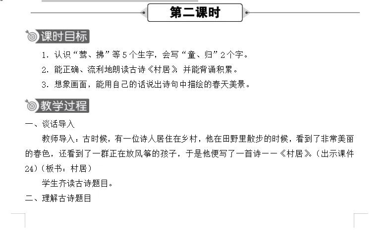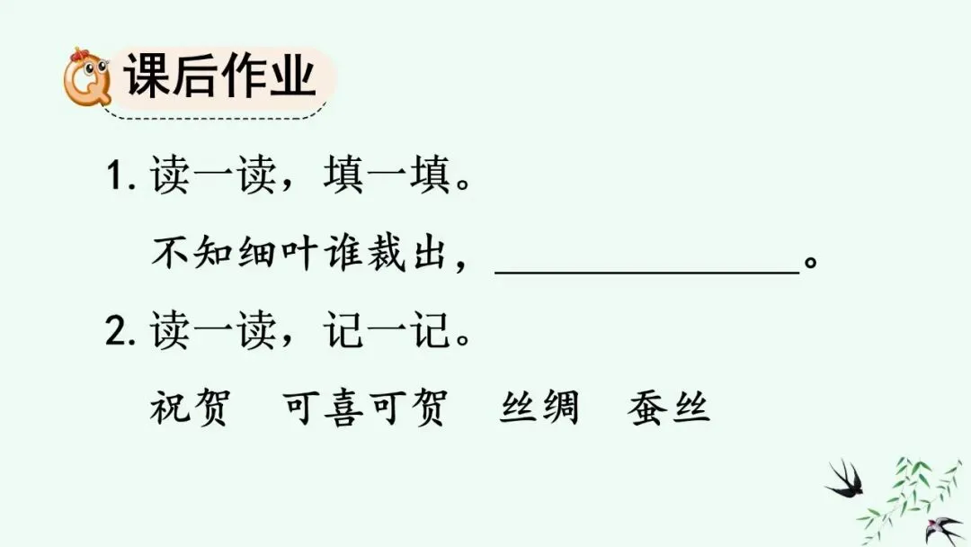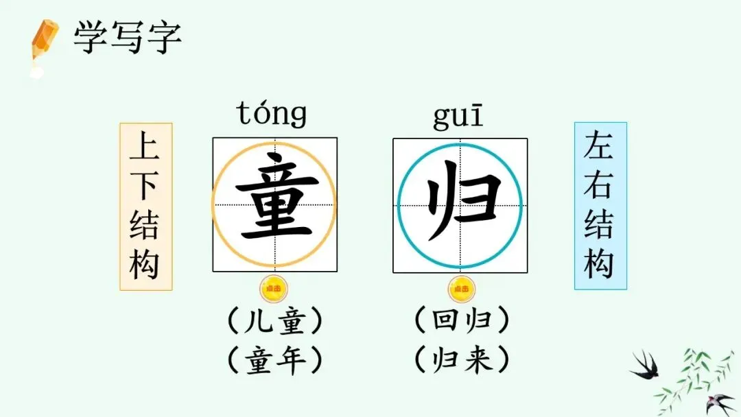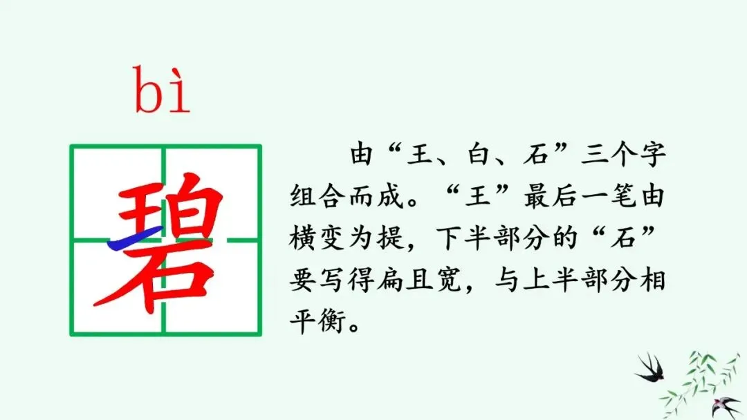 关注写字:此课的8个会写字中,“诗、妆、绿、归”是左右结构,书写时要注意左窄右宽,其中“绿”的最后四笔为“点、提、撇、捺”;“碧、丝、剪、童”是上下结构,要注意上下两部分的比例,要写得端正、平稳。此课要求写的字,可以和熟字组成常用词语识记。