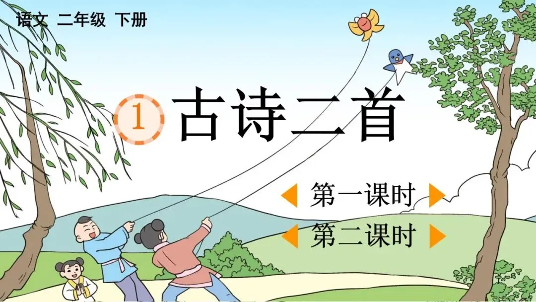 2.教师过渡:今天,我们继续学习两首和春天有关的古诗。读一读课文题目《古诗二首》,看一看“诗”字的写法。(出示课件4)