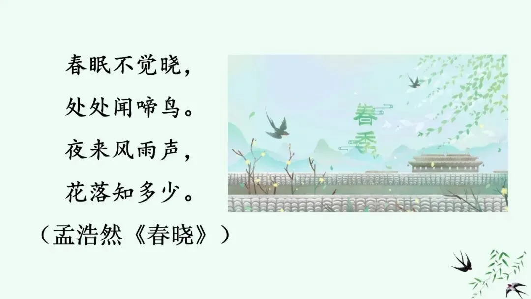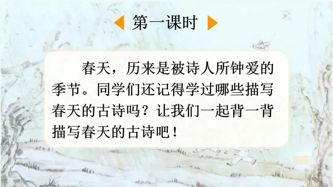 1.教师谈话导入:春天,历来是被诗人所钟爱的季节。同学们还记得学过哪些描写春天的古诗吗?让我们一起背一背描写春天的古诗吧!(出示课件3)
