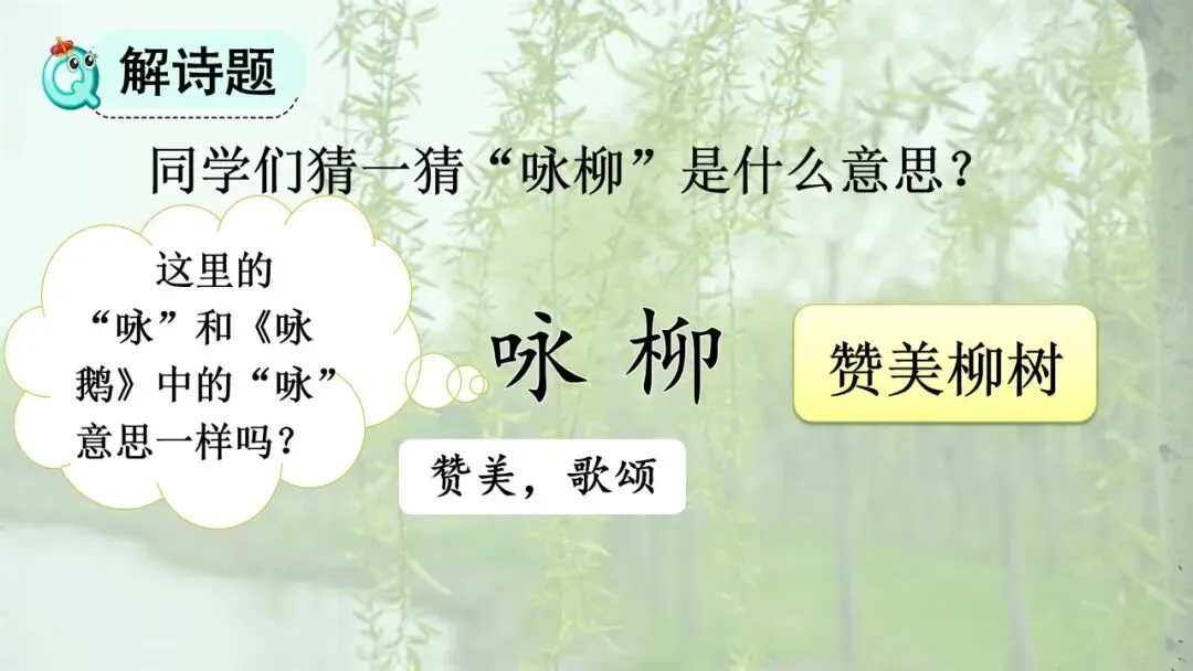 2.教师提问:同学们猜一猜“咏柳”是什么意思?这里的“咏”和《咏鹅》中的“咏”意思一样吗?(出示课件5)