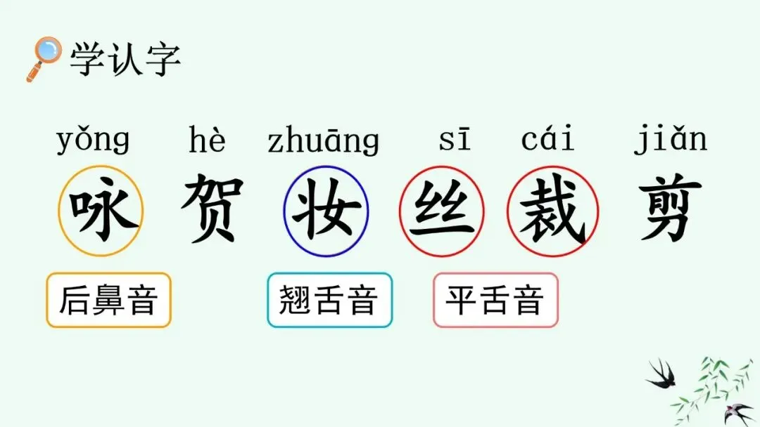 教师提示:“妆”是翘舌音,“丝、裁”是平舌音,“咏”是后鼻音。