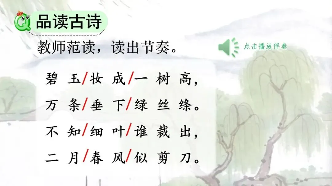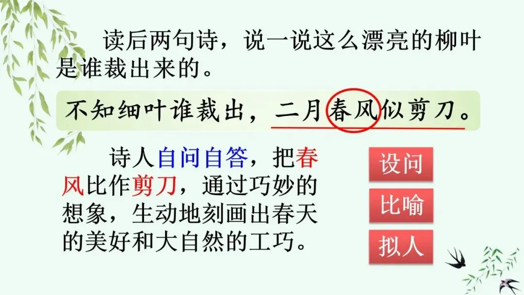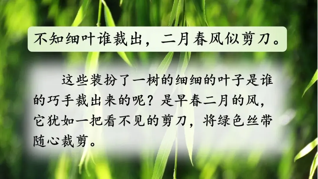 4.学习“不知细叶谁裁出,二月春风似剪刀”。(出示课件13、14)