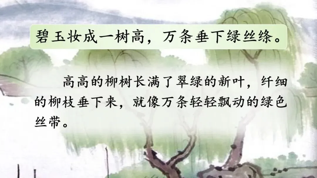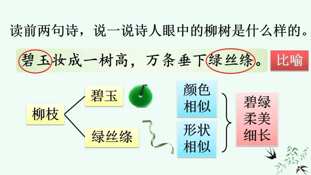教师点拨:高高的柳树长满了翠绿的新叶,纤细的柳枝垂下来,就像千万条轻轻飘动的绿色丝带。(板书:碧玉—一树高万条—绿丝绦赞柳)