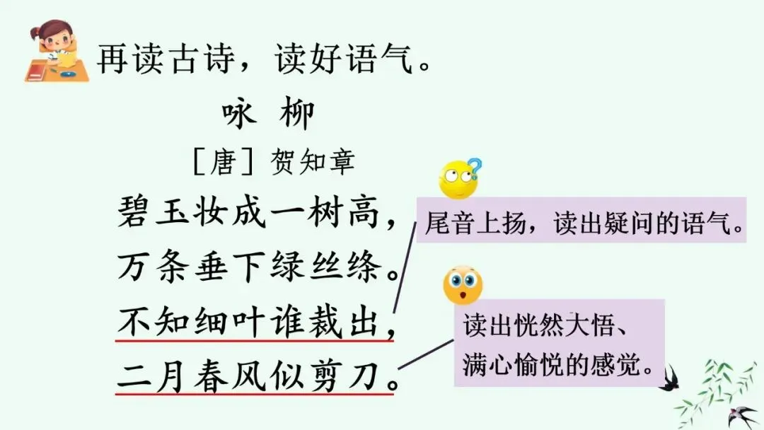 (1)指名让学生读,教师指导:读“不知细叶谁裁出”时,尾音上扬,读出疑问的语气;读“二月春风似剪刀”时,要读出恍然大悟、满心愉悦的感觉。