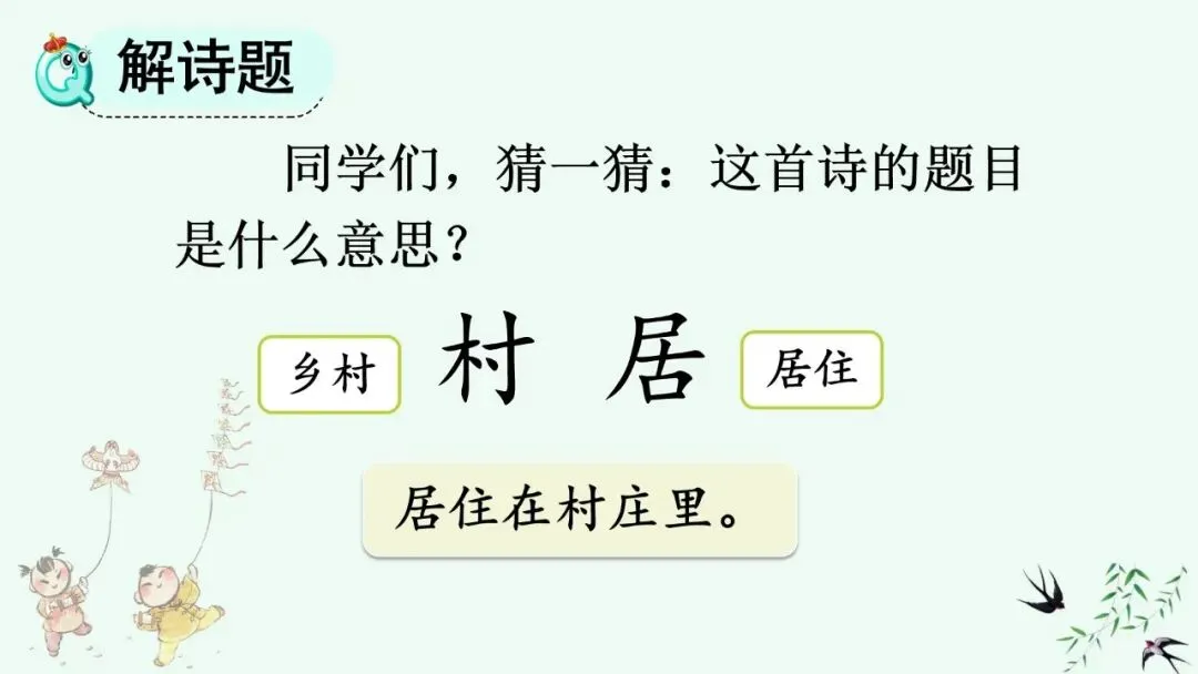 预设:“村”的意思是乡村;“居”的意思是居住。“村居”的意思是居住在村庄里。