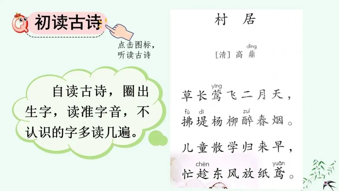 关注朗读:古诗教学应该将朗读作为教学的主要任务和手段。