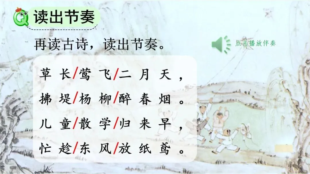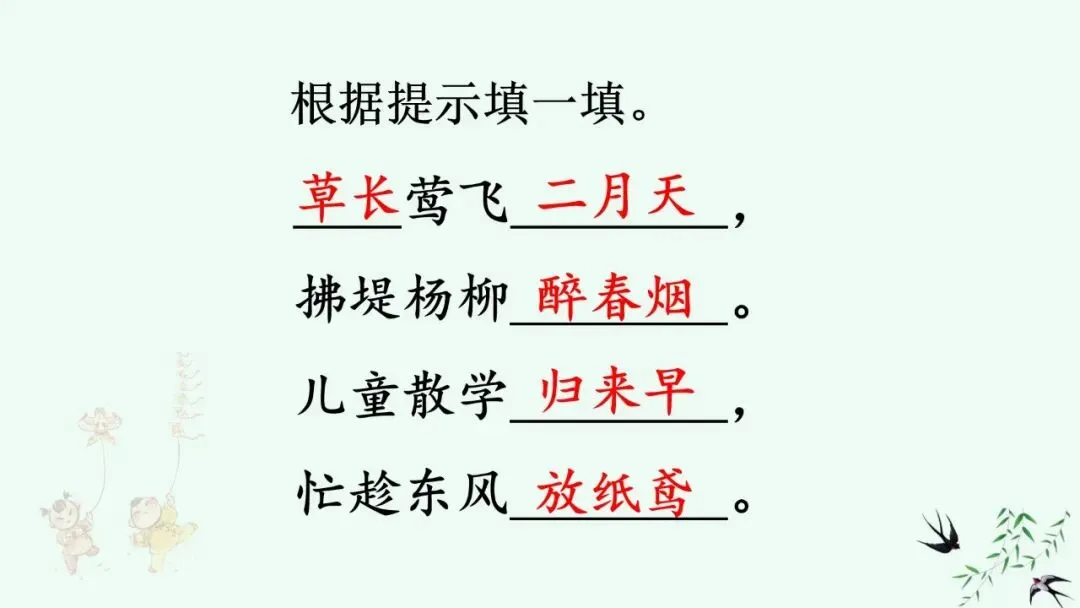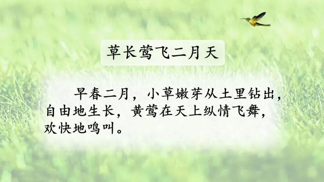 1.学习“草长莺飞二月天,拂堤杨柳醉春烟”。