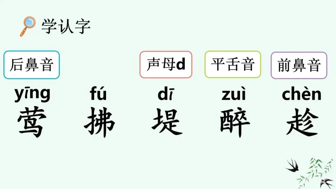 教师提示:“莺”是后鼻音,“堤”的声母是“d”,“醉”是平舌音,“趁”是前鼻音。