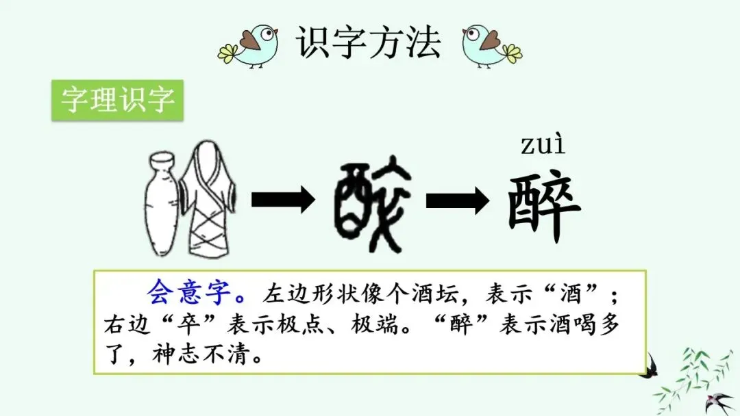 用字理识字的方法识记“醉”。教师指名让学生读,同学间注意纠正字音。