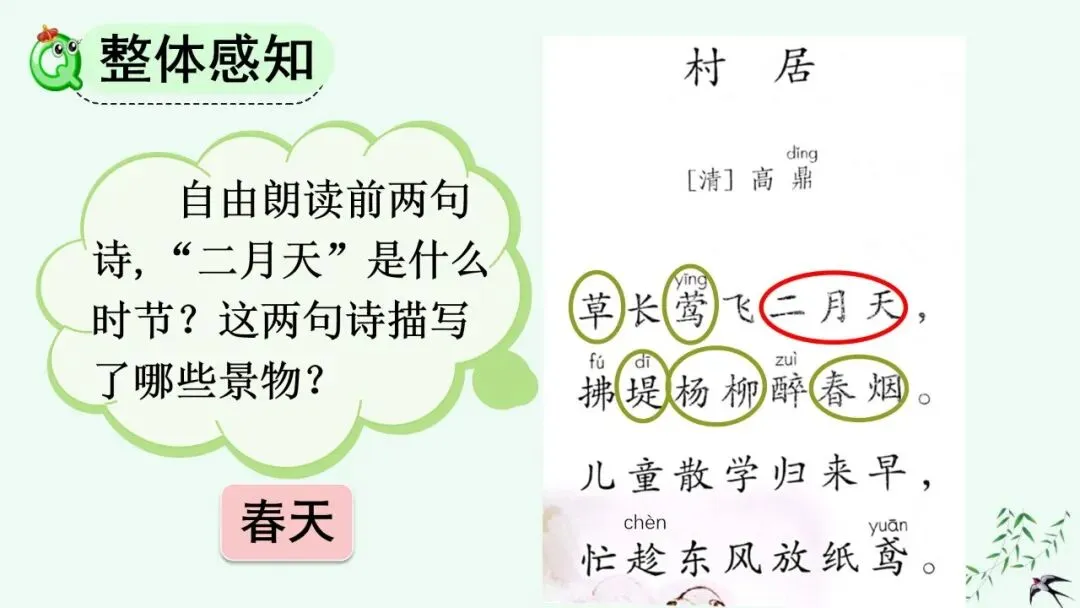 (1)教师提问:自由朗读前两句诗,“二月天”是什么时节?这两句诗描写了哪些景物?(出示课件30)