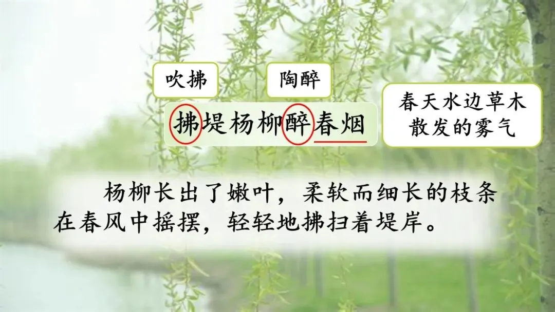 ②教师追问:再说一说“拂堤杨柳醉春烟”这句诗的意思。